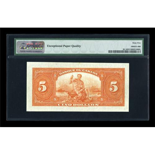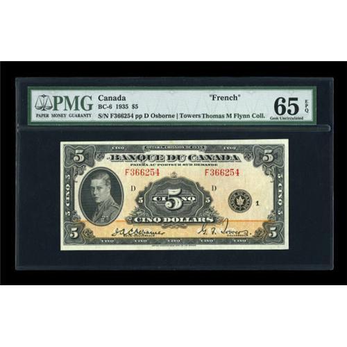 <B>BC-6 $5 1935</B></I><BR> A spectacular note which is one of the highlights of the Flynn Canadian holdings. This French Text $5 is the only one of its kind of the 18 graded to date by PMG to achieve the Gem designation. The colors are nothing short of brilliant, and the originality is evident even through the PMG holder. If you desire the finest and can afford the tariff, this is a note you should resolve to return home with. <B>PMG Gem Uncirculated 65 EPQ</B></I>...magnifique.<BR><I>From The Thomas M. Flynn Collection</B></I><BR><BR><b>Shipping:</b> Coins & Currency (<a target="_blank" href="http://www.heritageauctions.com/common/shipping.php">view shipping information</a>)