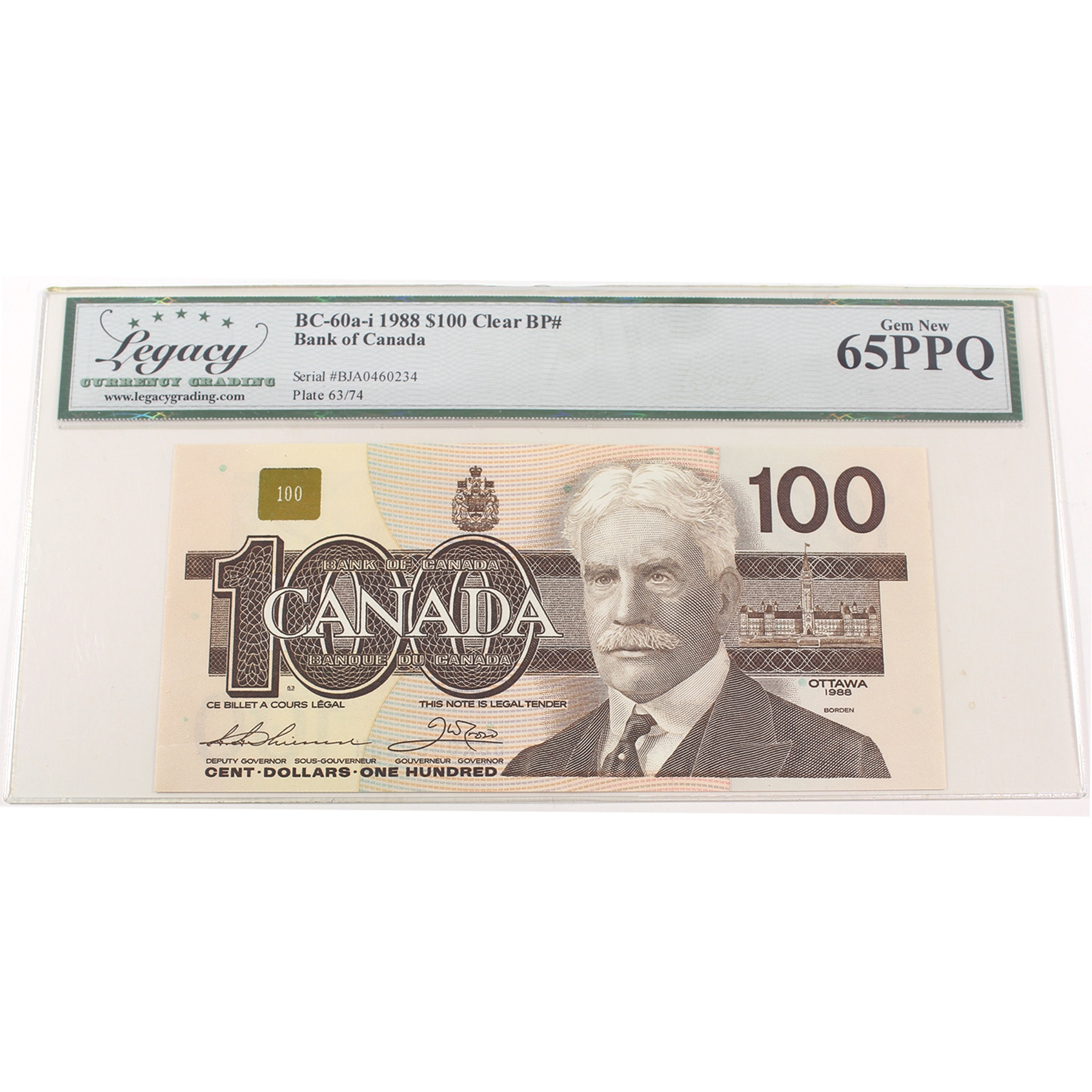 BC-60a-i 1988 $100 Clear BP# Legacy GEM UNC65 PPQ Thiessen-Crow SN:BJA0460234