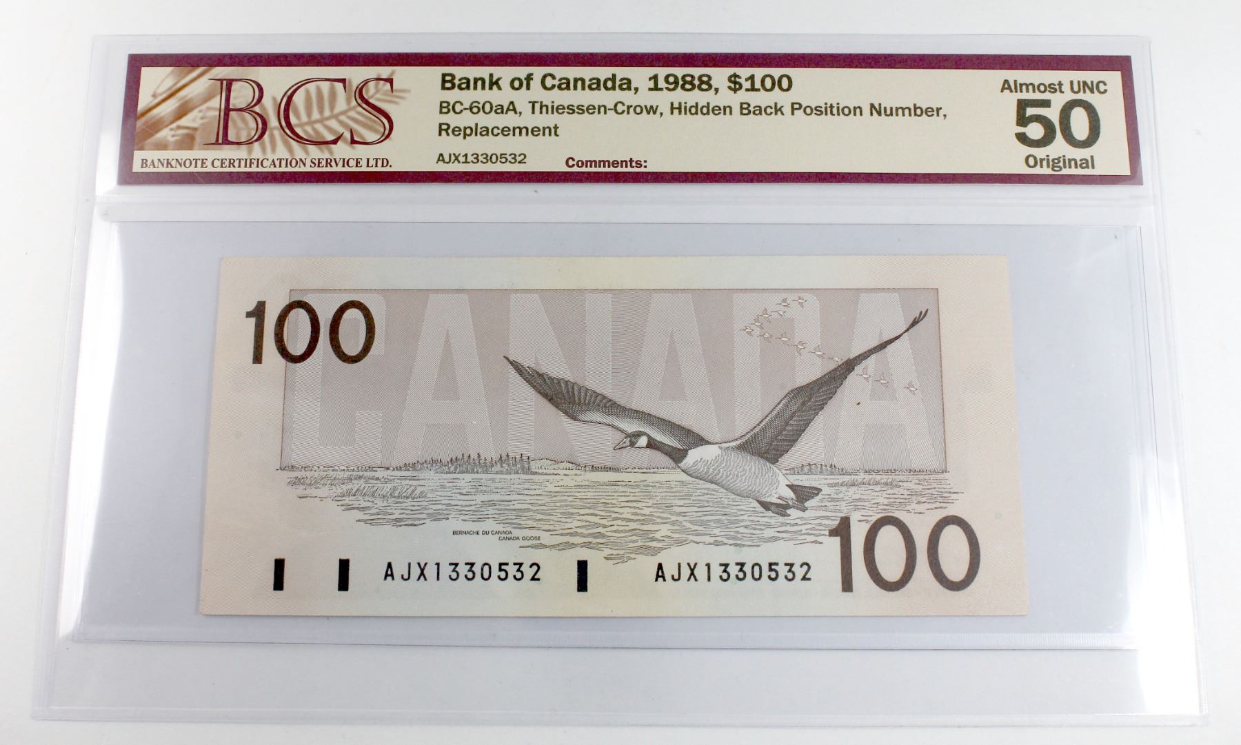 BC-60aA 1988 Bank of Canada $100, Thiessen-Crow, Hidden Back Position Number, Replacement, S/N: AJX1330532, BCS Certified AU-50 Original.