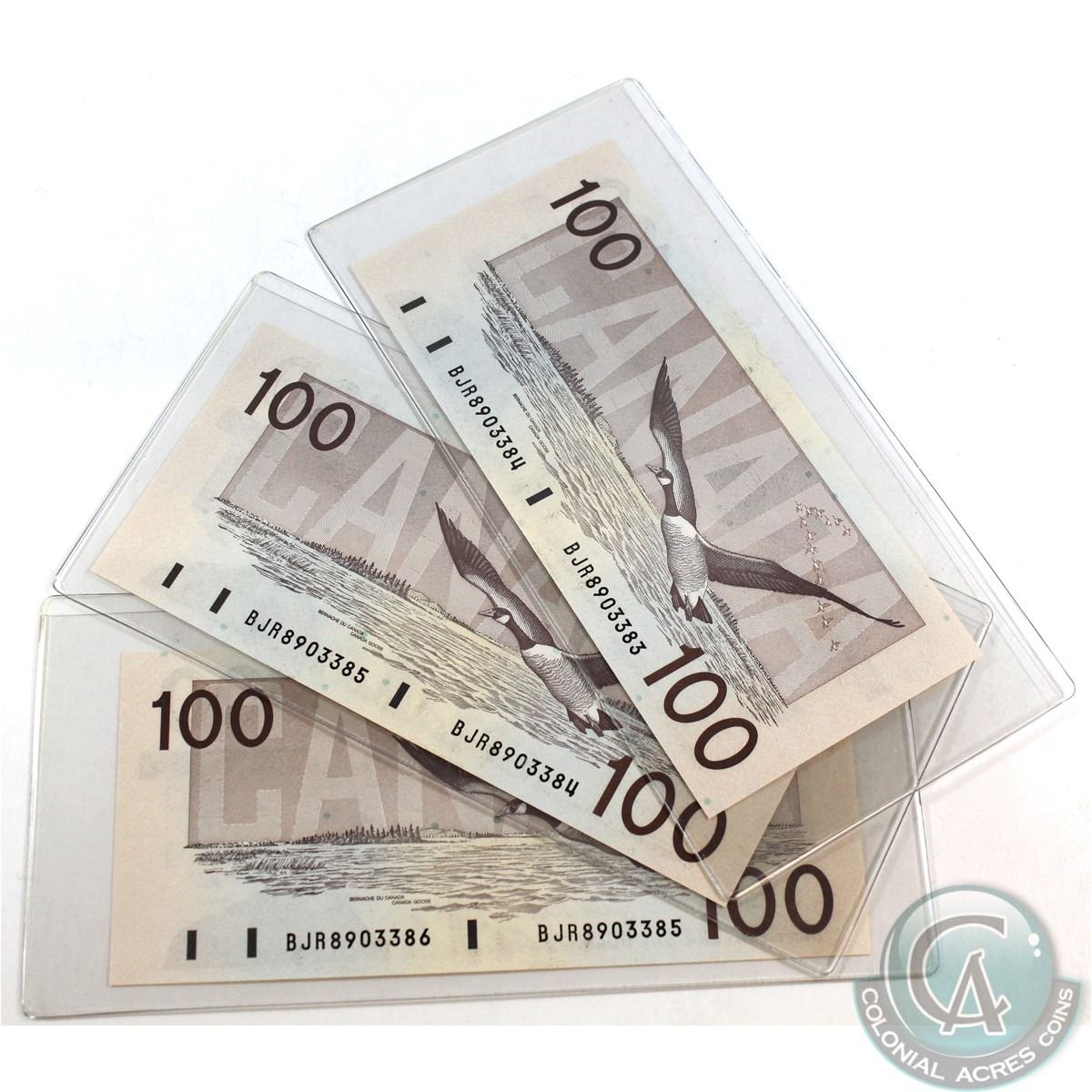 BC-60d Lot of 3x 1988 $100 Knight-Dodge with Mismatched Serial Numbers. S/N: BJR8903384/83, BJR8903385/84, & BJR8903386/85. Uncirculated
