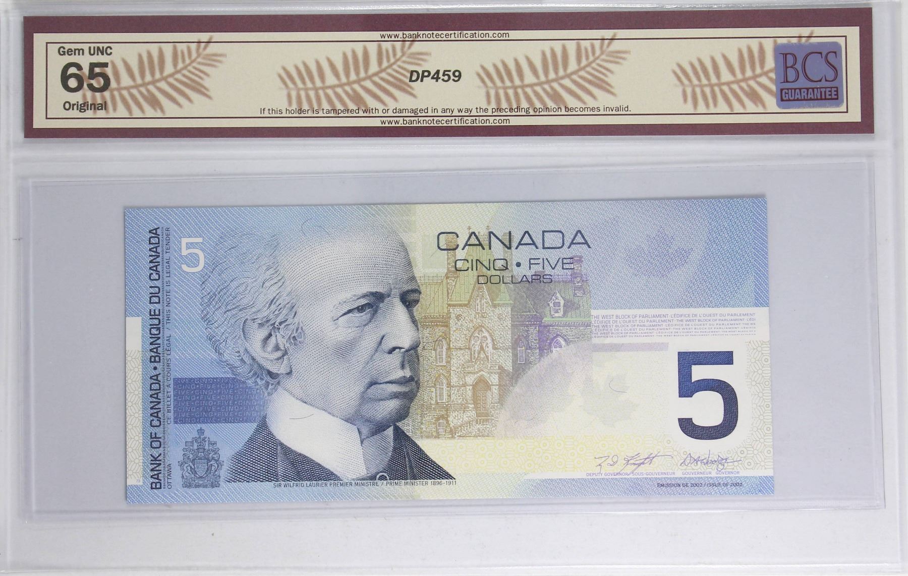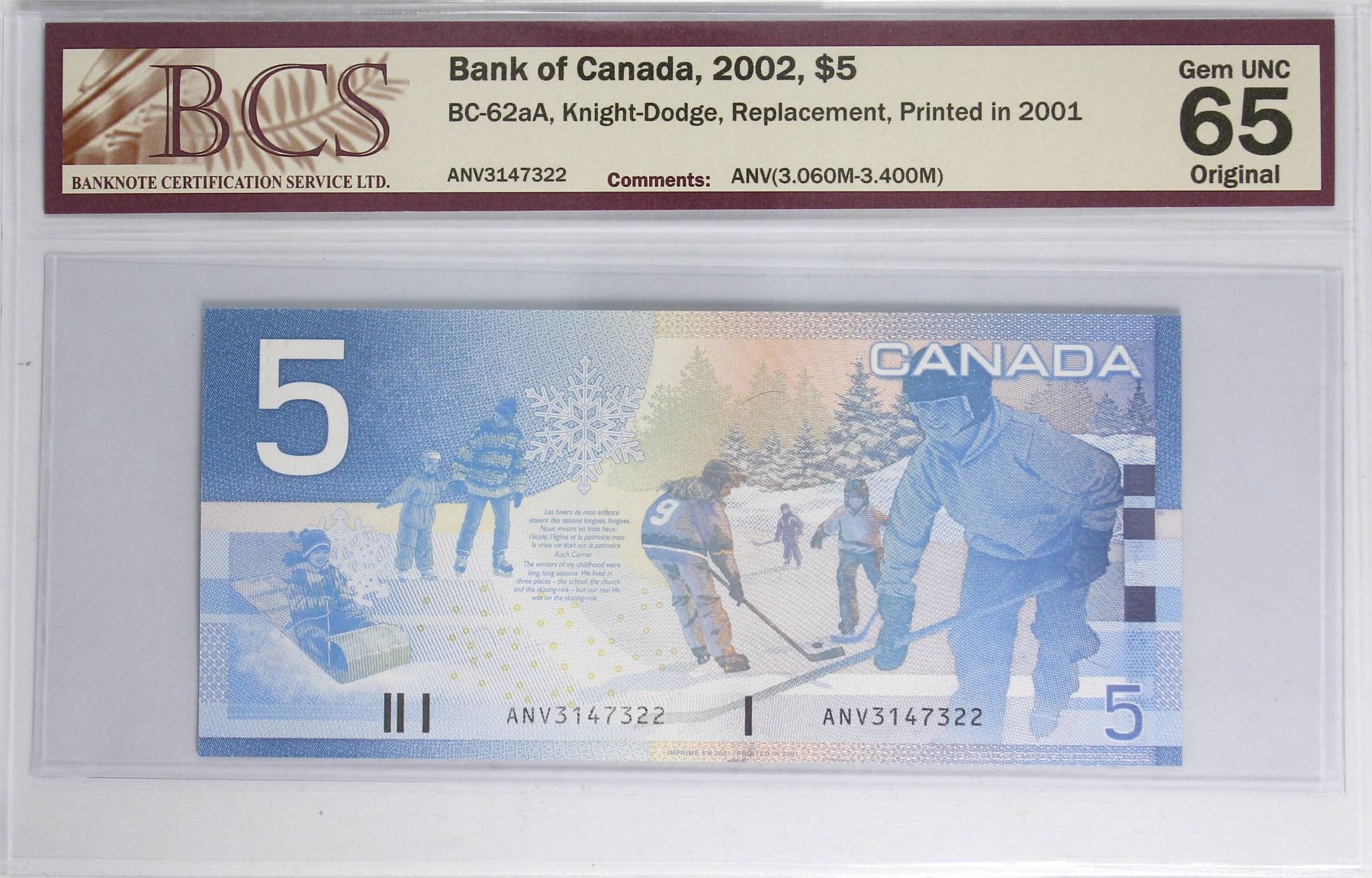 BC-62aA 2002 Canada $5 Knight-Dodge, SN:ANV3147322, BCS Certified Banknote in Gem UNC-65 Original Condition.