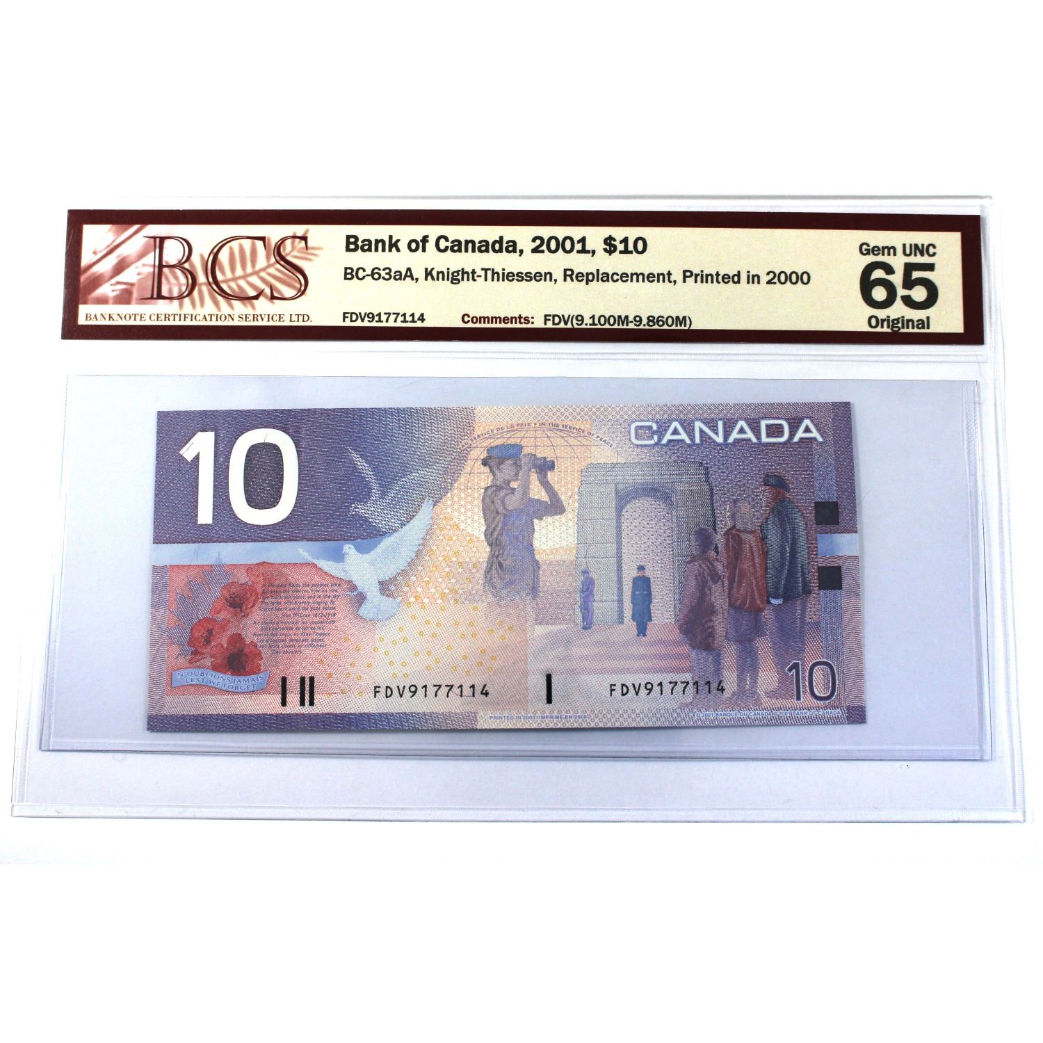 BC-63aA 2001 $10 BCS Certified GUNC-65 Original, Knight-Thiessen, Replacement, Printed in 2000, FDV (9.1M-9.86M), FDV9177114