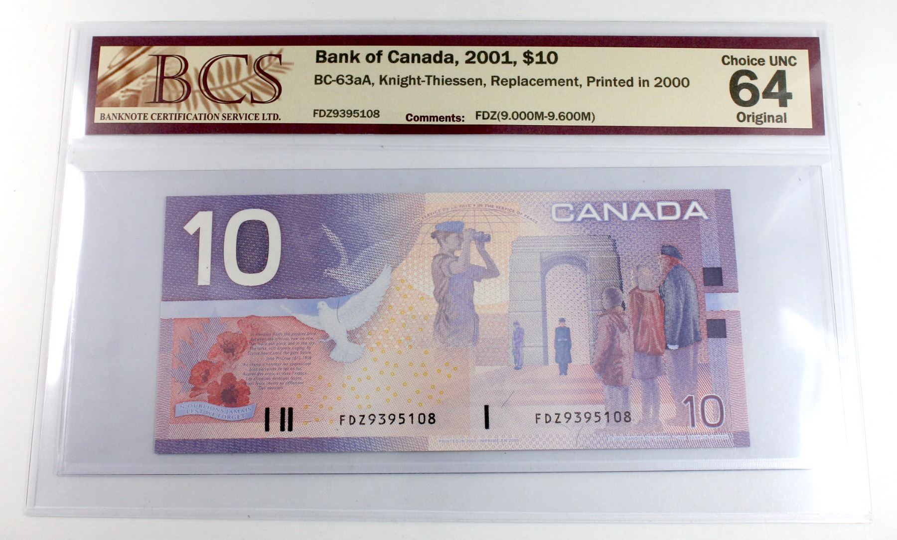 BC-63aA 2001 Bank of Canada $10, Knight-Thiessen, Replacement, Printed in 2000, S/N: FDZ9395108, BCS Certified CUNC-64 Original