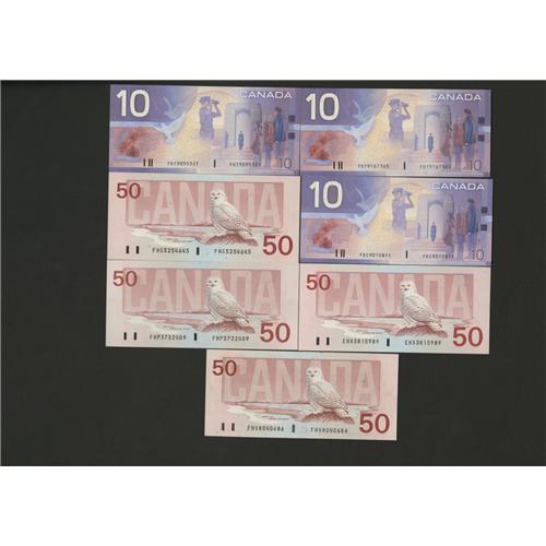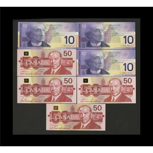 <B>BC-63aA (2); 63b $10 2000-1</B></I><BR><B>BC-59a; 59aA; 59b; 59d $50 1988.</B></I><BR>All seven notes grade <B>Gem Crisp Uncirculated.</B></I> The replacement $50 has prefix letters EHX.