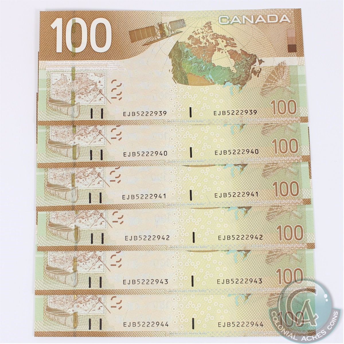 BC-66a-i. Run of 6 Consecutive 2004 Bank of Canada $100, Jenkins-Dodge, S/N: EJB5222939-944 all in UNC Condition. 6pcs