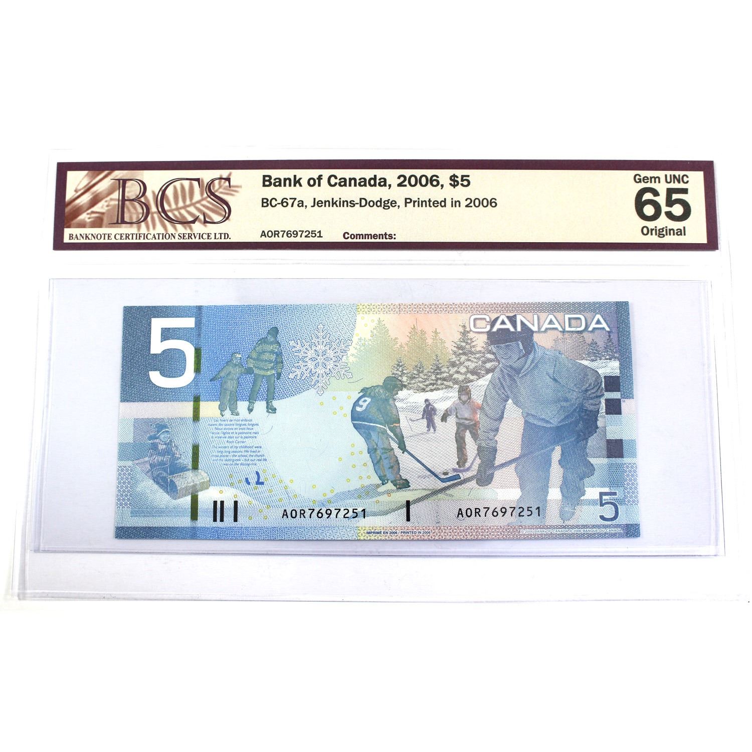 BC-67a 2006 Bank of Canada $5, Jenkins-Dodge, Printed in 2006, S/N: AOR7697251, BCS Certified GUNC-65 Original.