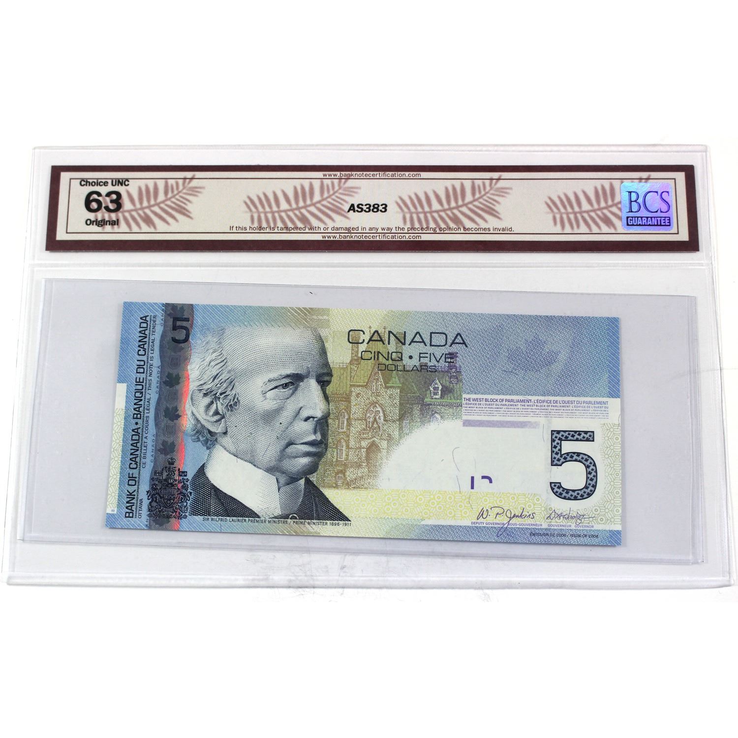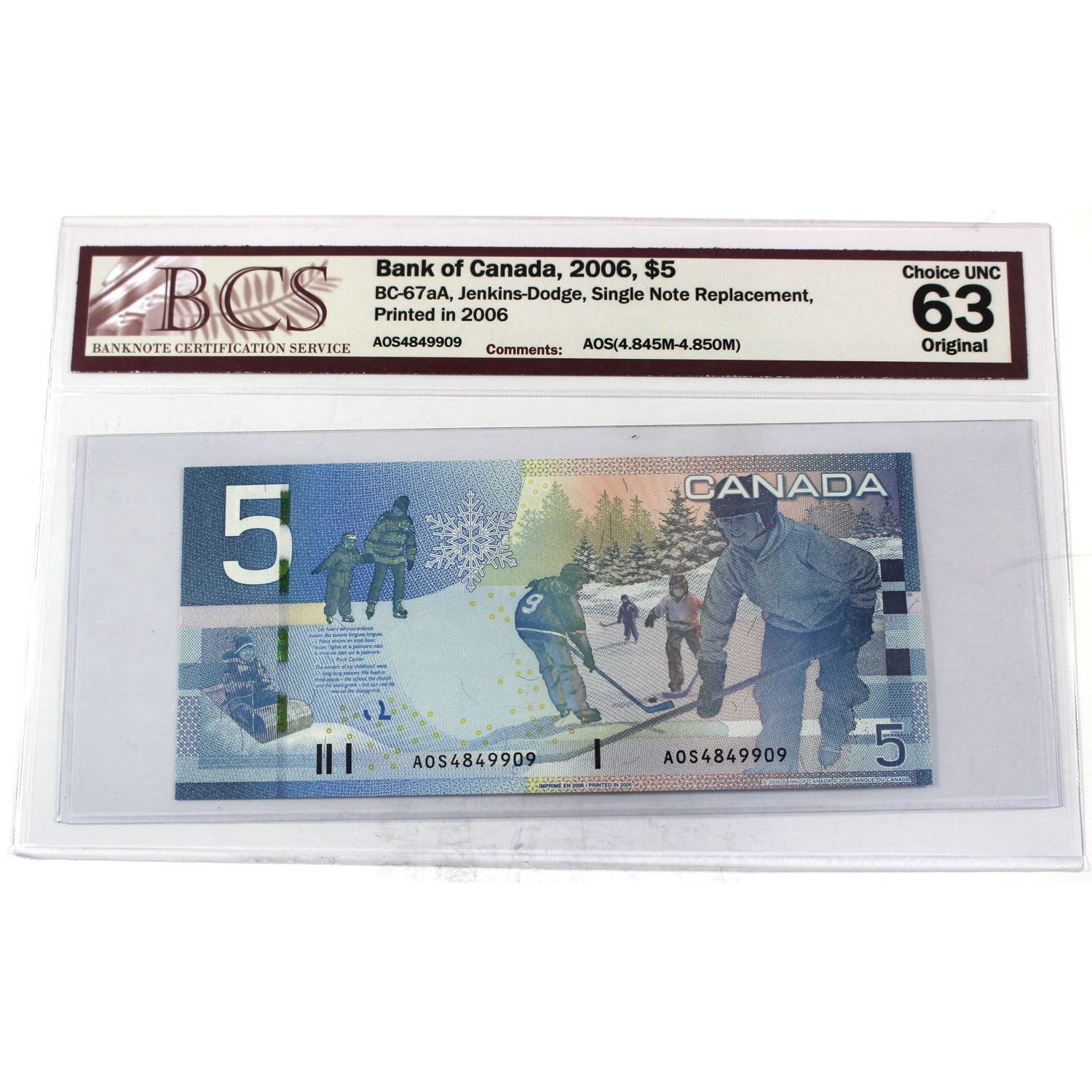 BC-67aA 2006 Canada $5, Jenkins-Dodge, Single Note Replacement, Printed in 2006, SN: AOS4849909, BCS Certified CUNC-63 Original