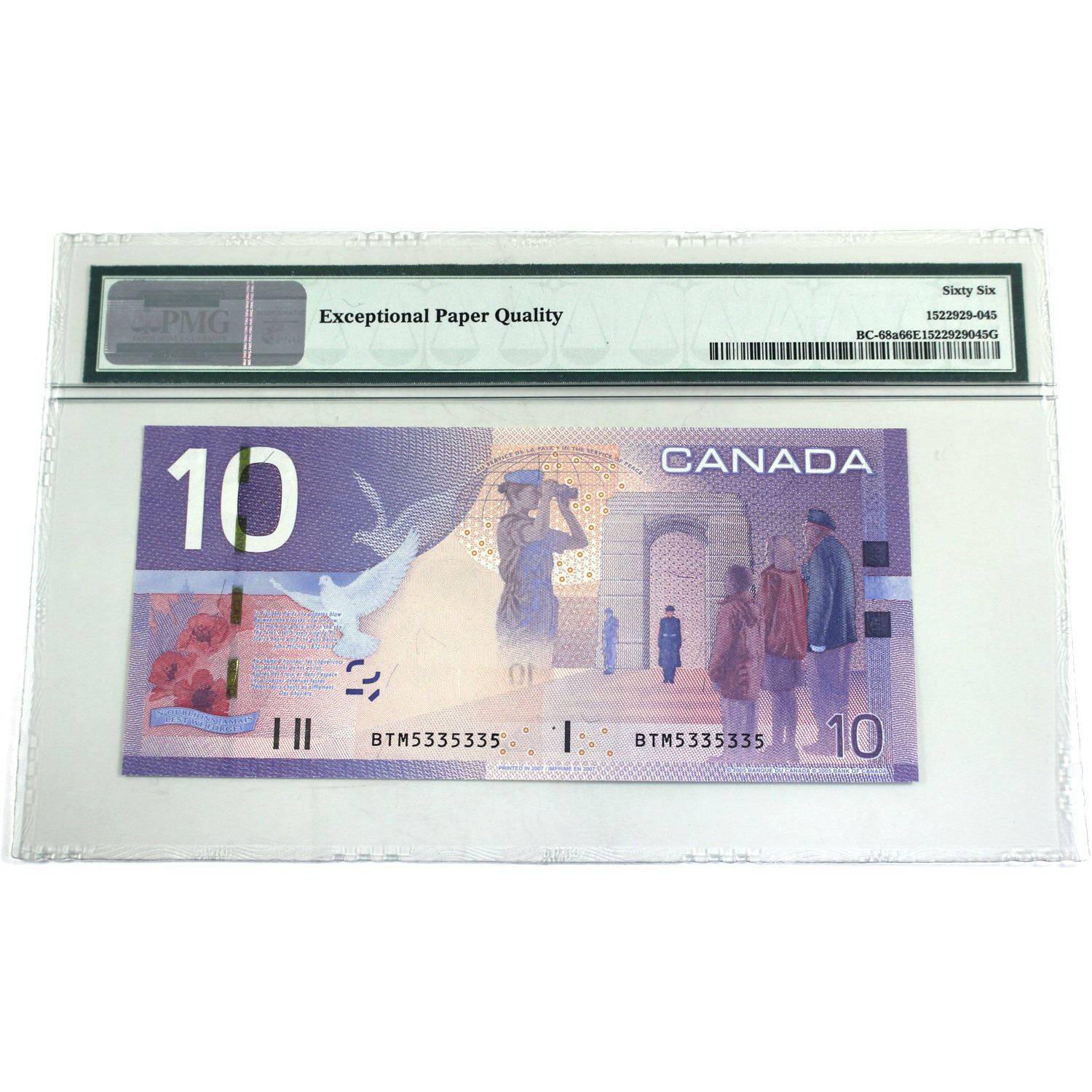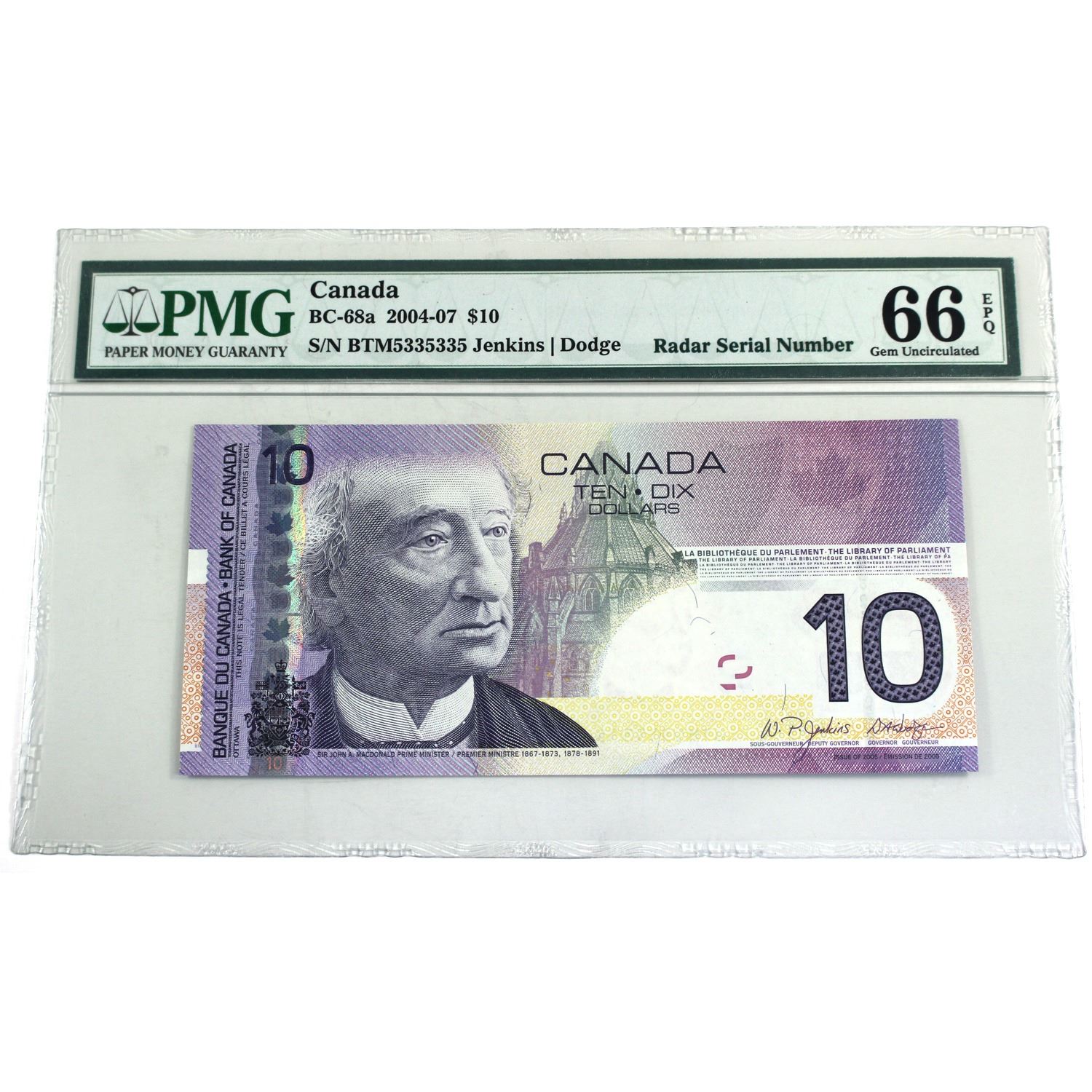 BC-68a 2004-07 Canada $10, Jenkins-Dodge, 2 Digit RADAR, SN: BTM5335335,PMG Certified Gem UNC-66 EPQ