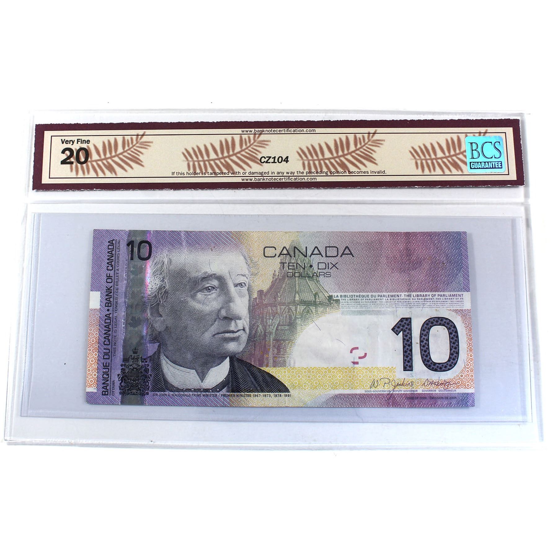 BC-68a-E6-ii 2005 Bank of Canada 'Double Denomination Error' $10, Jenkins-Dodge S/N: BTU2186178, BCS Certified VF-20. This $10 Bill was printed on $20 Security Paper.