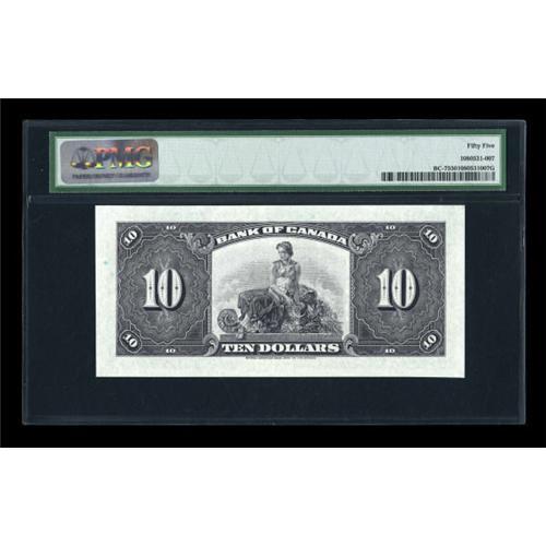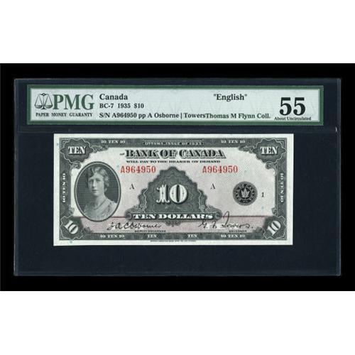 <B>BC-7 $10 1935</B></I><BR> An exceptionally well margined English Text $10 which has been graded <B>About Uncirculated 55</B></I> by PMG.<BR><I>From The Thomas M. Flynn Collection</B></I><BR><BR><b>Shipping:</b> Coins & Currency (<a target="_blank" href="http://www.heritageauctions.com/common/shipping.php">view shipping information</a>)