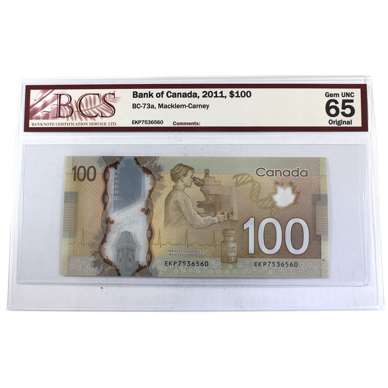 BC-73a 2011 $100 BCS GUNC65 Original Macklem-Carney, SN: EKP7536560