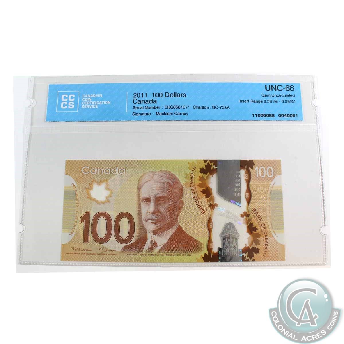 BC-73aA 2011 Bank of Canada Replacement $100, Macklem-Carney, EKG0581671, CCCS GUNC-66, Insert Range (0.581M - 0.582M)