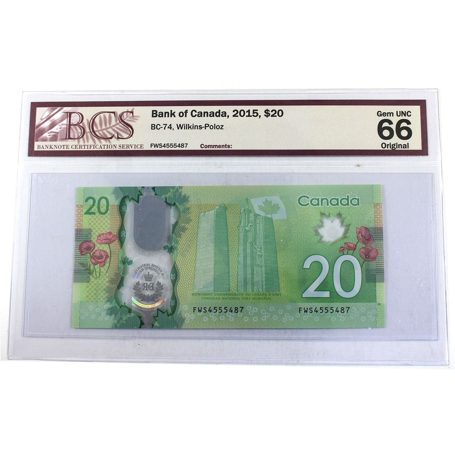 BC-74 2015 $20 BCS GUNC66 Original Wilkins-Poloz, SN: FWS4555487