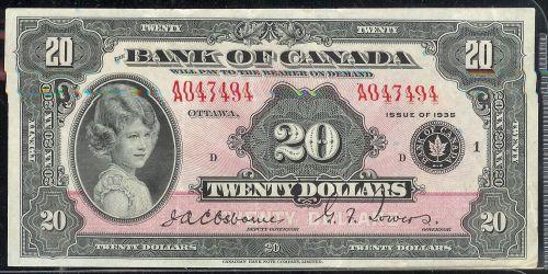 BC-9a 1935 $20 English text "Large seal" A047494, About EF, Clean and bright. Scarce in this grade.