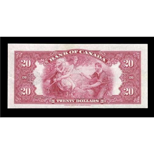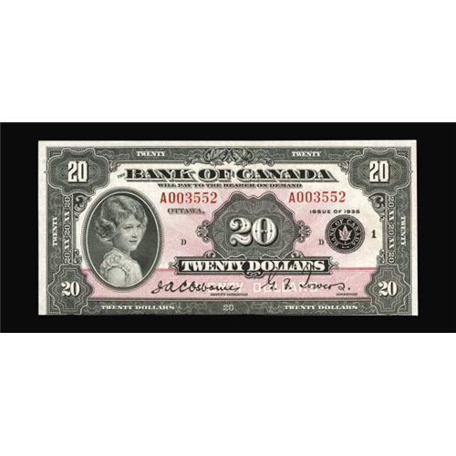 <B>BC-9a $20 1935</B></I><BR>The English Text large seal variety, a very scarce note in the highest grade ranges. This piece is <B>Crisp Uncirculated,</B></I> but the bottom margin is trimmed virtually into the design.<BR><I>From The Halton Lake Collection</B></I>