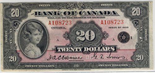 BC-9b 1935 $20 English text "Small seal" A108723. A very clean VF note but closely cropped.