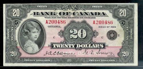 BC-9b 1935 $20 Small seal English text A200486. Lovely and original VF-EF example. Bright and vibrant colours. Scarce this nice.