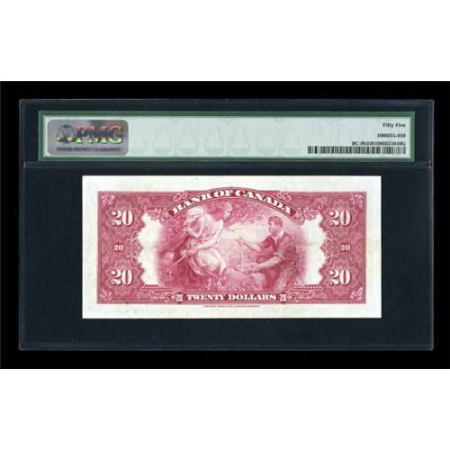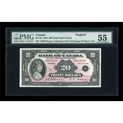<B>BC-9b $20 1935</B></I><BR> A bright and nicely centered piece which features a portrait of HRH Princess Elizabeth, now Queen Elizabeth, as a (very) young child. PMG <B>Choice About Uncirculated 55.</B></I><BR><I>From The Thomas M. Flynn Collection</B></I><BR><BR><b>Shipping:</b> Coins & Currency (<a target="_blank" href="http://www.heritageauctions.com/common/shipping.php">view shipping information</a>)