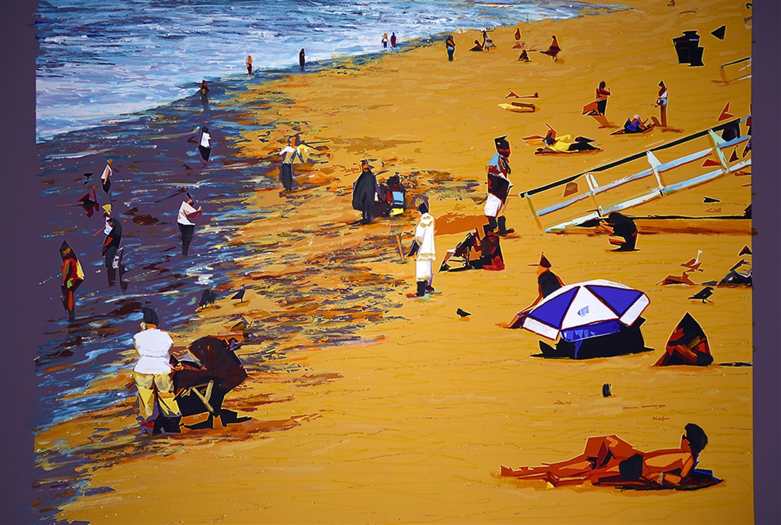A Bragg unique giclee on paper, embellished with acrylic, fabric paint, colored pencil and glitter. Catch summer rays with colorful characters on a warm, sparkling Santa Monica Beach. 24 x 16