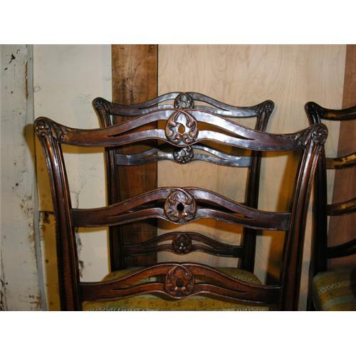 VERY HANDSOME SET OF CHIPPENDALE CHAIRS, ONE ARM FIVE SIDES IN GREAT CONDITION, BUT IN NEED OF UPHOLSTERY.HAND CARVED WITH FINE DETAIL,NICE ORIGINAL FINISH, STRAIGHT MOLDED LEG AND STRETCHERS FOR EXTRA STABILITY.