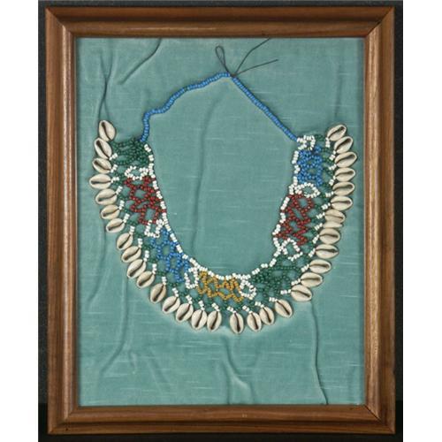 ETHNOGRAPHIC MATERIAL: A cowrie shell and polychrome bead necklace derived in its design from traditional tribal Oceanic or West African sources, in frame under glass on pale green velvet ground.