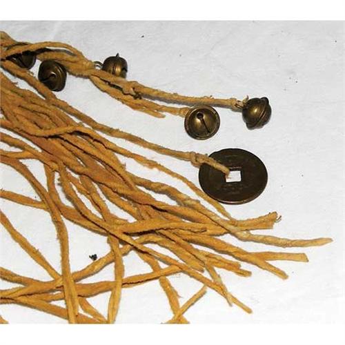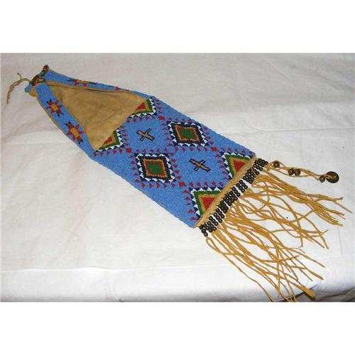 Beaded pipe bag with 6'' fringe. Attached to the fringe is an old token as well as bells.