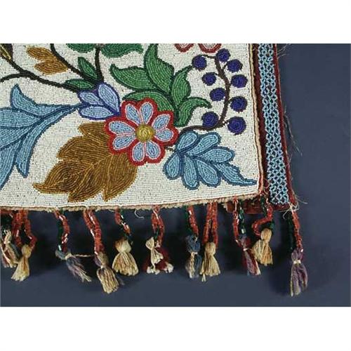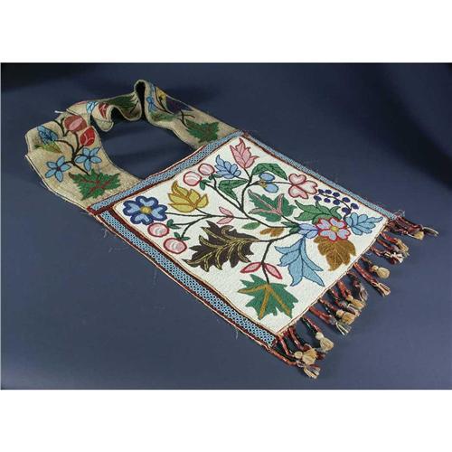 NATIVE BEADWORK: Hand-beaded bandolier likely Chippewa, circa 1890. 17'' x 17'' not including handle.