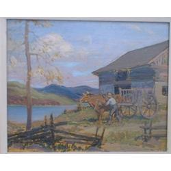 BEAMENT, Thomas Harold, P.R.C.A., 1898-1984. "The Ox-Cart". Huile sur panneau, signée. Signée, titrée et datée "1929" verso. Oil on board, signed. Signed, titled and dated "1929" verso. 9" x 11" - 22.8cm x 28cm. $600/900
