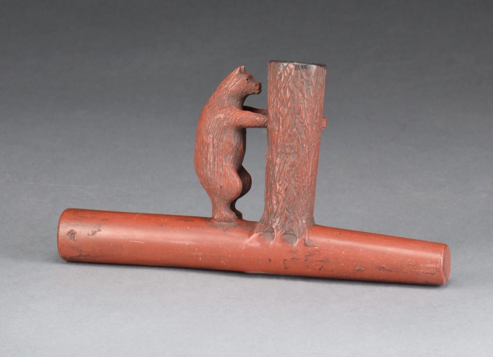A Native American catlinite pipe possibly, Lakota Sioux, depicting a bear w/ its right front paw inserted in the hollow of a tree likely searching for honey. As w/ most catlinite pipes, the exact age of this pipe is difficult to determine but it is an exceptionally well executed specimen. CONDITION: pipe shows use & some wear w/ no notable damage. (02-14020/BF). $800-1,600.