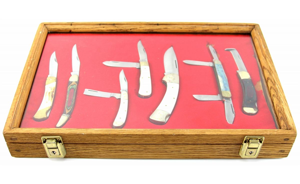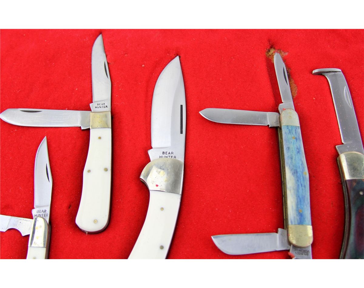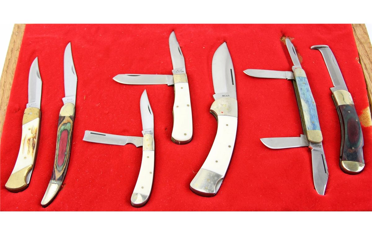 BEAR HUNTER SEVEN KNIFE CASED SET Bear Hunter 7 knife set, in oak presentation case. Type: Knife Country: US Condition: Overall good
