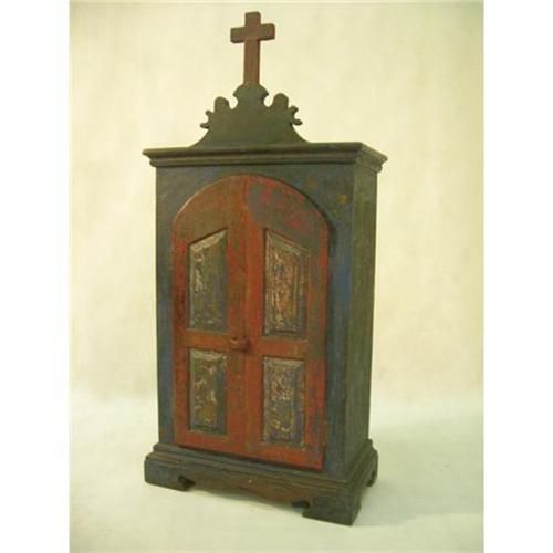 DECORATIVE BRAZILIAN ORATORY, CEDDAR WOOD, WITH ORIGINAL IN BLUE AND RED PAINTING ON THE OUTSIDE.