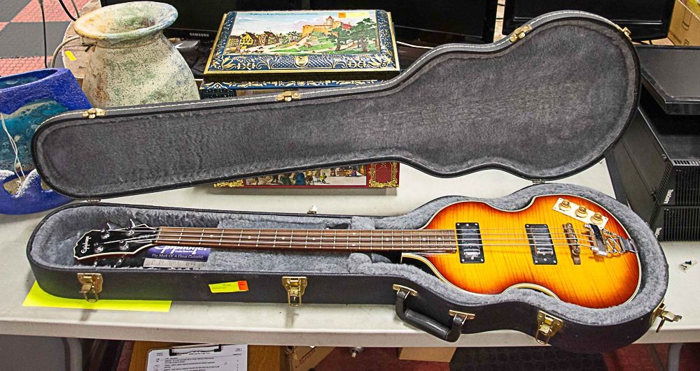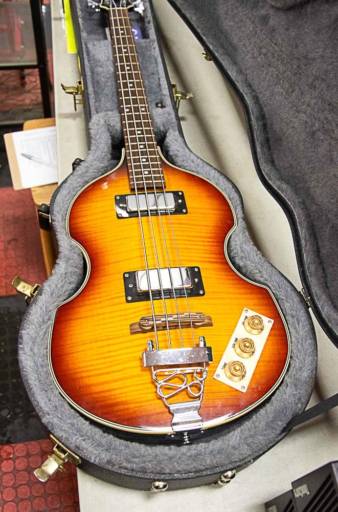 EPIPHONE VIOLA BASS (NOTE: THERE ARE STICKERS ON THE BACK) IN GOOD WORKING CONDITION. COMES WITH HARD TOP CASE.
