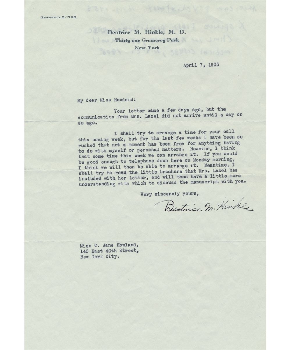 (1874–1953) Pioneering American feminist, psychoanalyst, writer, and translator, the first to present Carl Jung's writing to the English-speaking world. T.L.S. her letterhead, 1p. 4to., New York, Apr. 7, 1933 to a lady discussing meeting to review her manuscript received via a Mrs. Lazel. Very good.