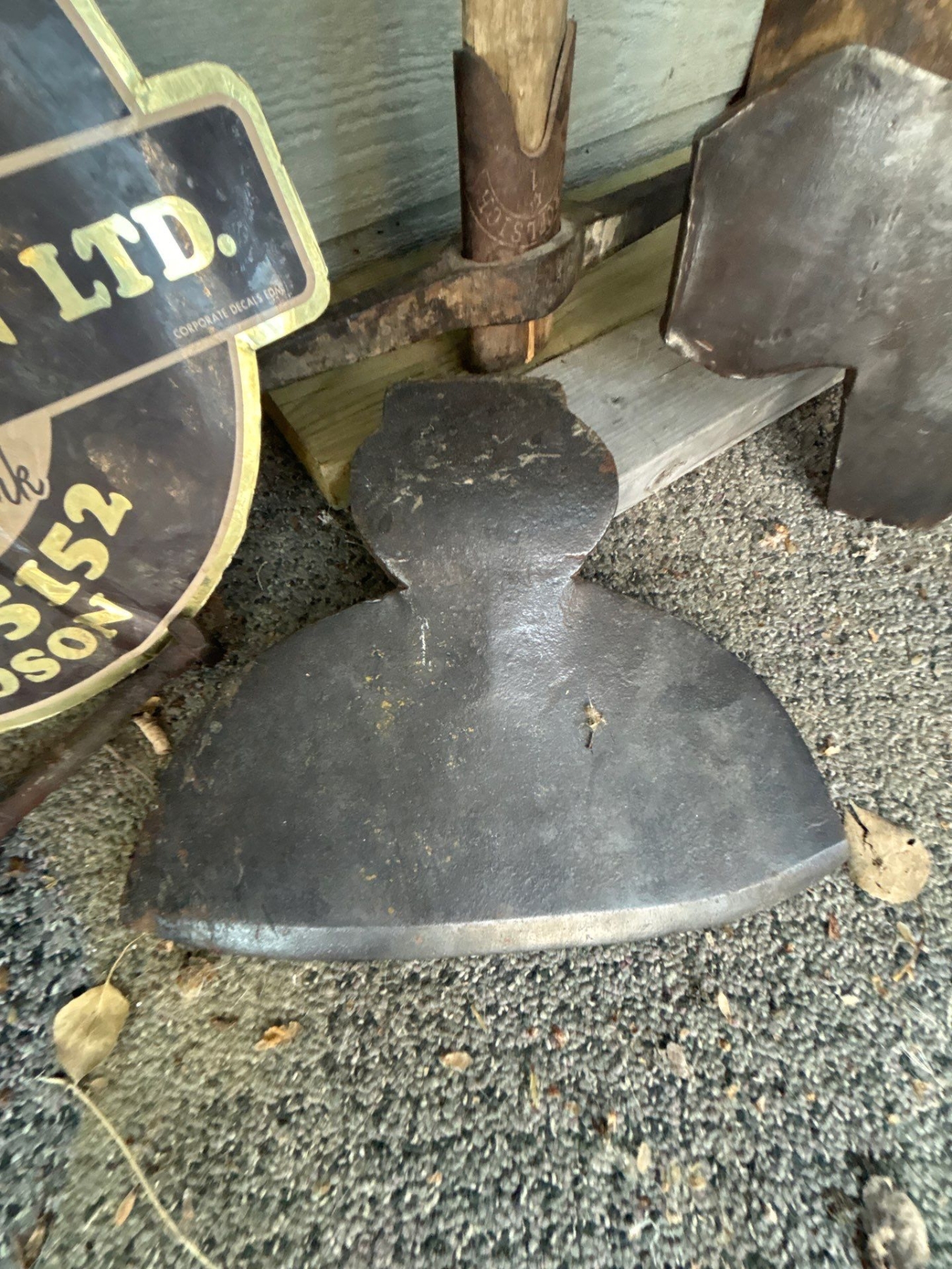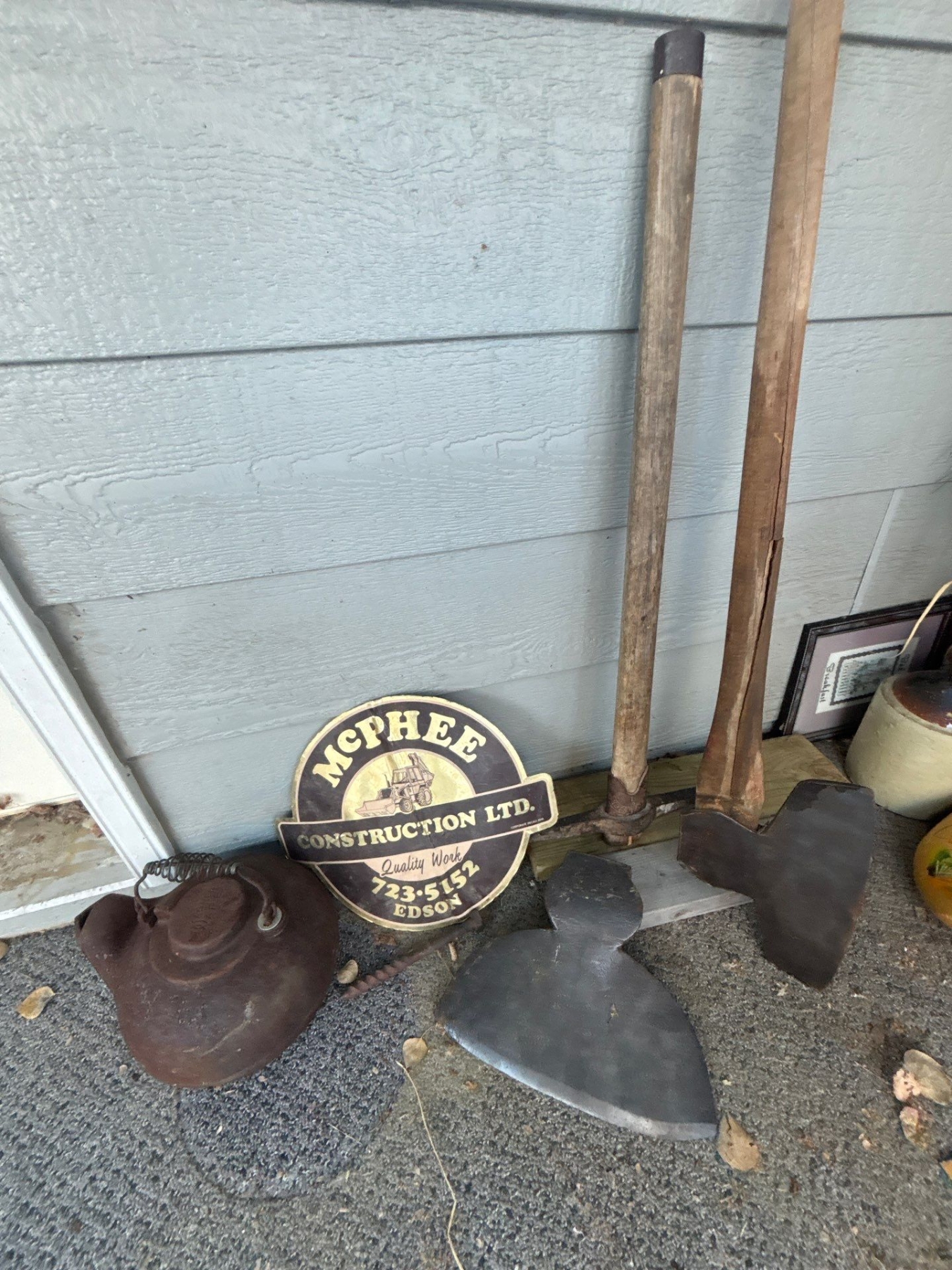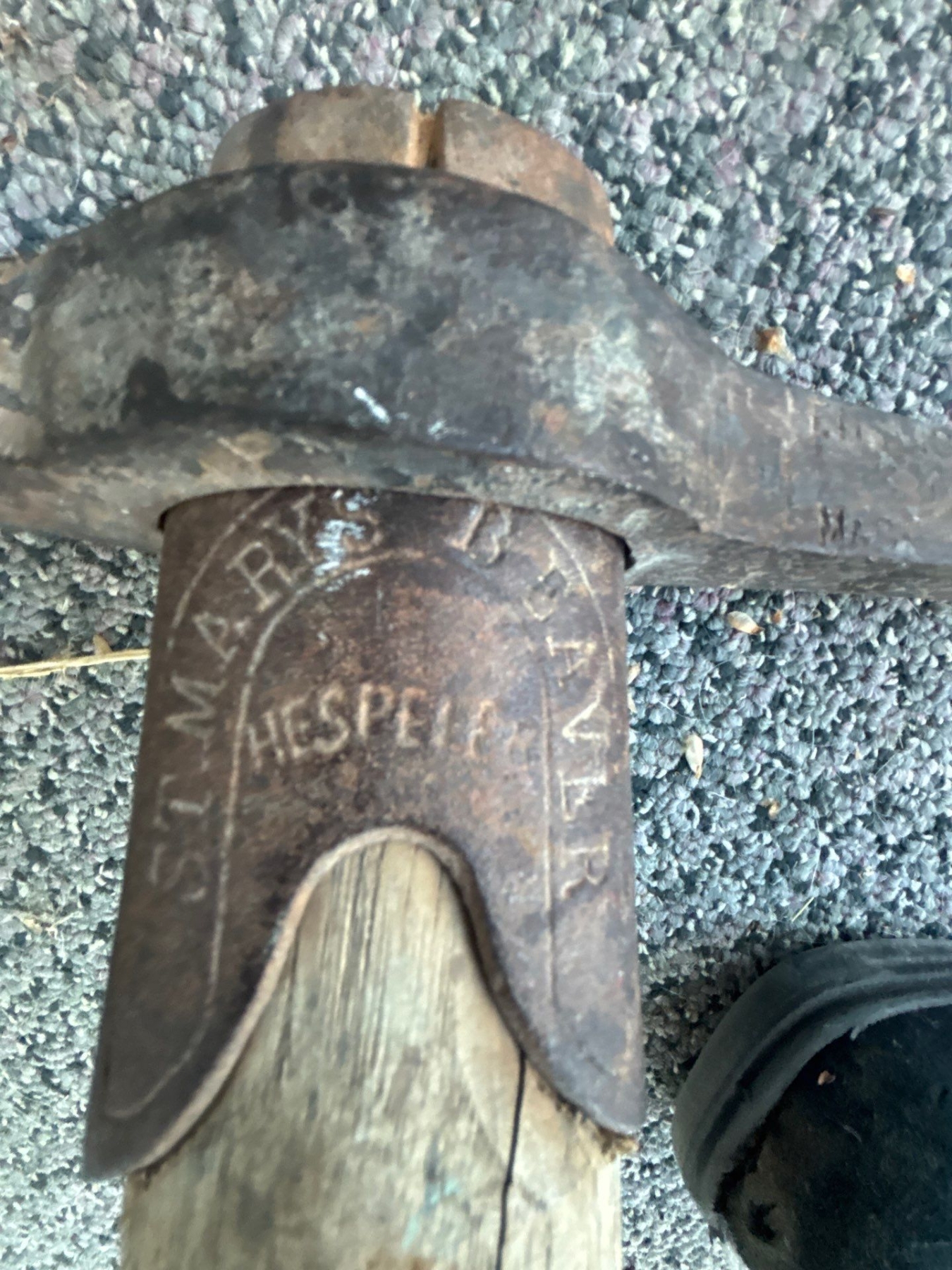 antique miner's pick known as a bulldog head with a wooden handle guard made by ST MARYS and HESPER with a cast iron antique kettle .