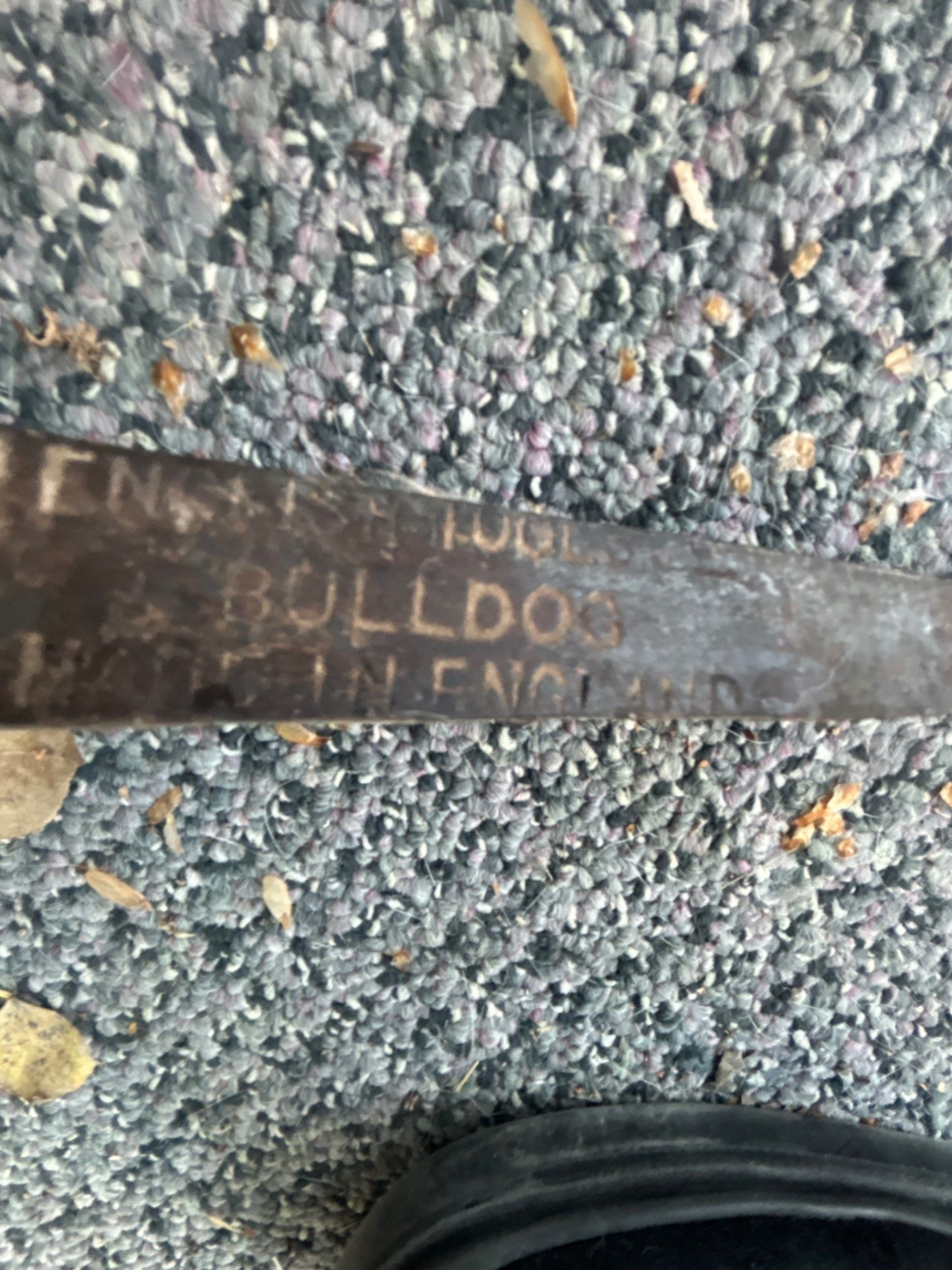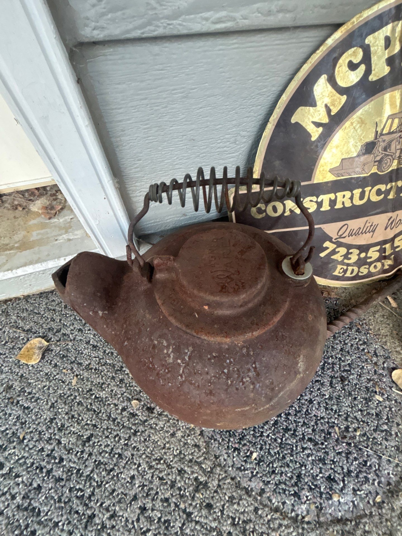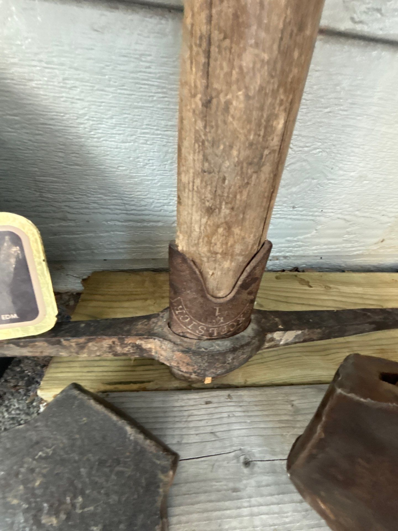 antique miner's pick known as a bulldog head with a wooden handle guard made by ST MARYS and HESPER with a cast iron antique kettle .
