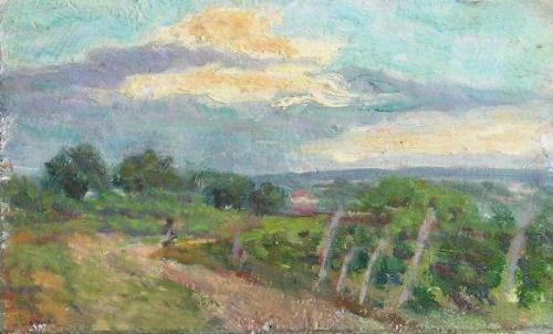 BEAU, Hénri, R.C.A., 1863-1949. "Paysage d'été". Huile sur panneau, signée. Oil on board, signed. 5 1/2" x 8 3/4" - 13.9cm x 22.2cm.