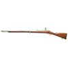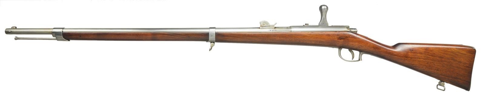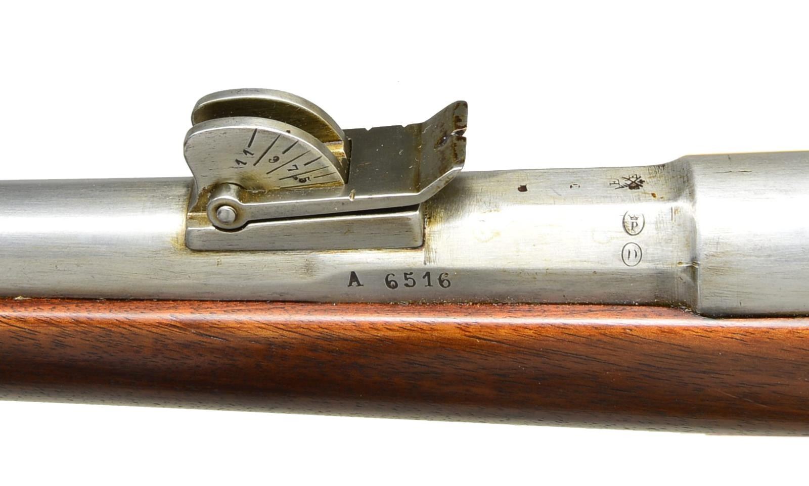 PROOFS. Cal. 11.4x51R. S# A 6516. Bbl. 32 1/4", fitted on right side w/ bayonet lug. Open rear sight graduated to 1100m. Stud type front sight. Beaumont type bolt w/ mainspring in bolt handle. Receiver fitted on right side w/ latch to hold bolt in open position. Receiver has been heavily cleaned removing any markings. Proof marks over chamber appear to be French. Cleaning rod is present. 2 Band design. Walnut stock. Stock has been cleaned rendering marking on right side of butt illegible. CONDITION: stock has had professional type cleaning & refinish w/ slight loss of wood in inletted areas & very light wear & handling marks. Metal has been heavily cleaned, notably on receiver, but has light staining & wear. Good, shiny bore w/ strong rifling. (01-19360/RW). ANTIQUE. $1,500-2,000.