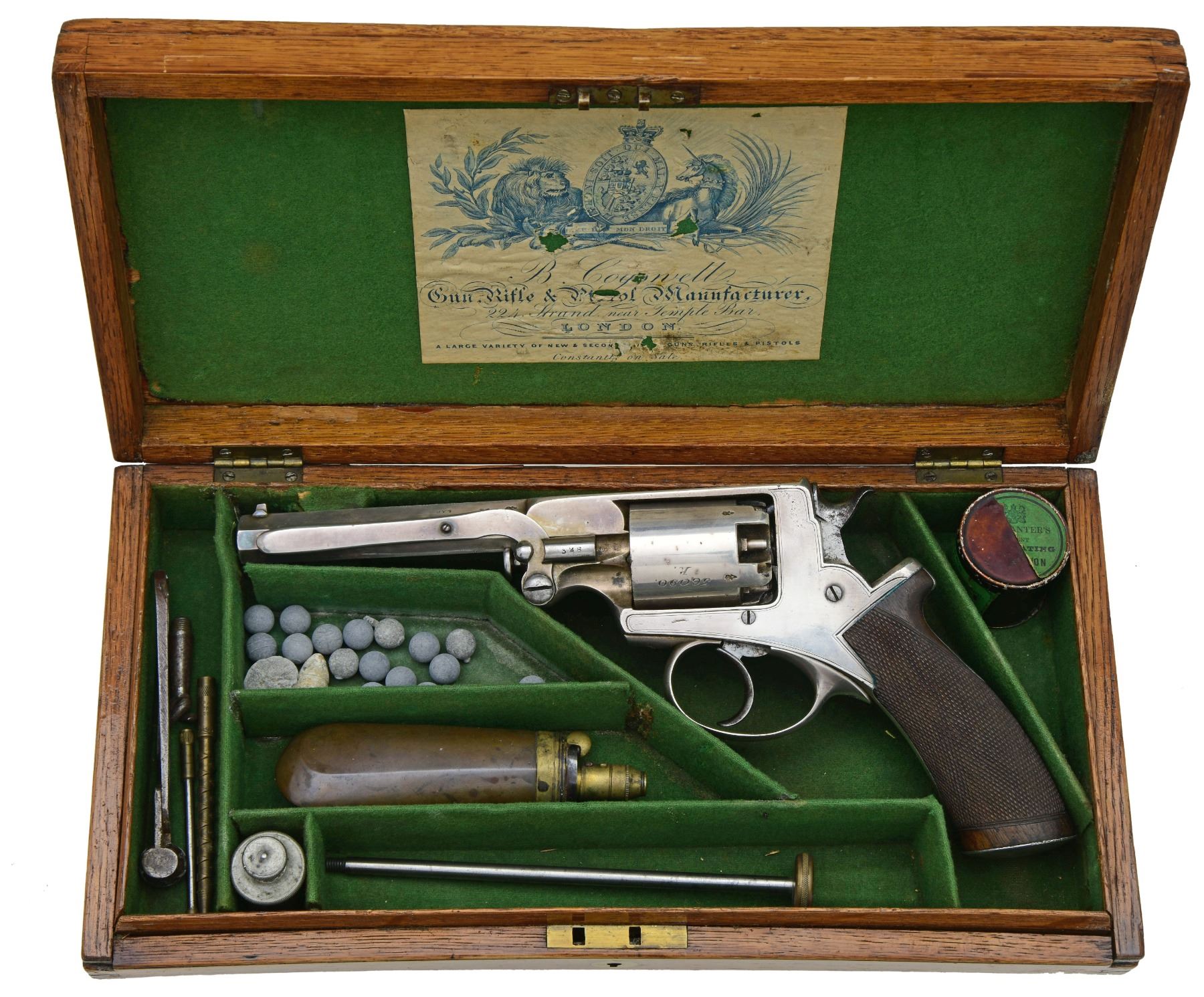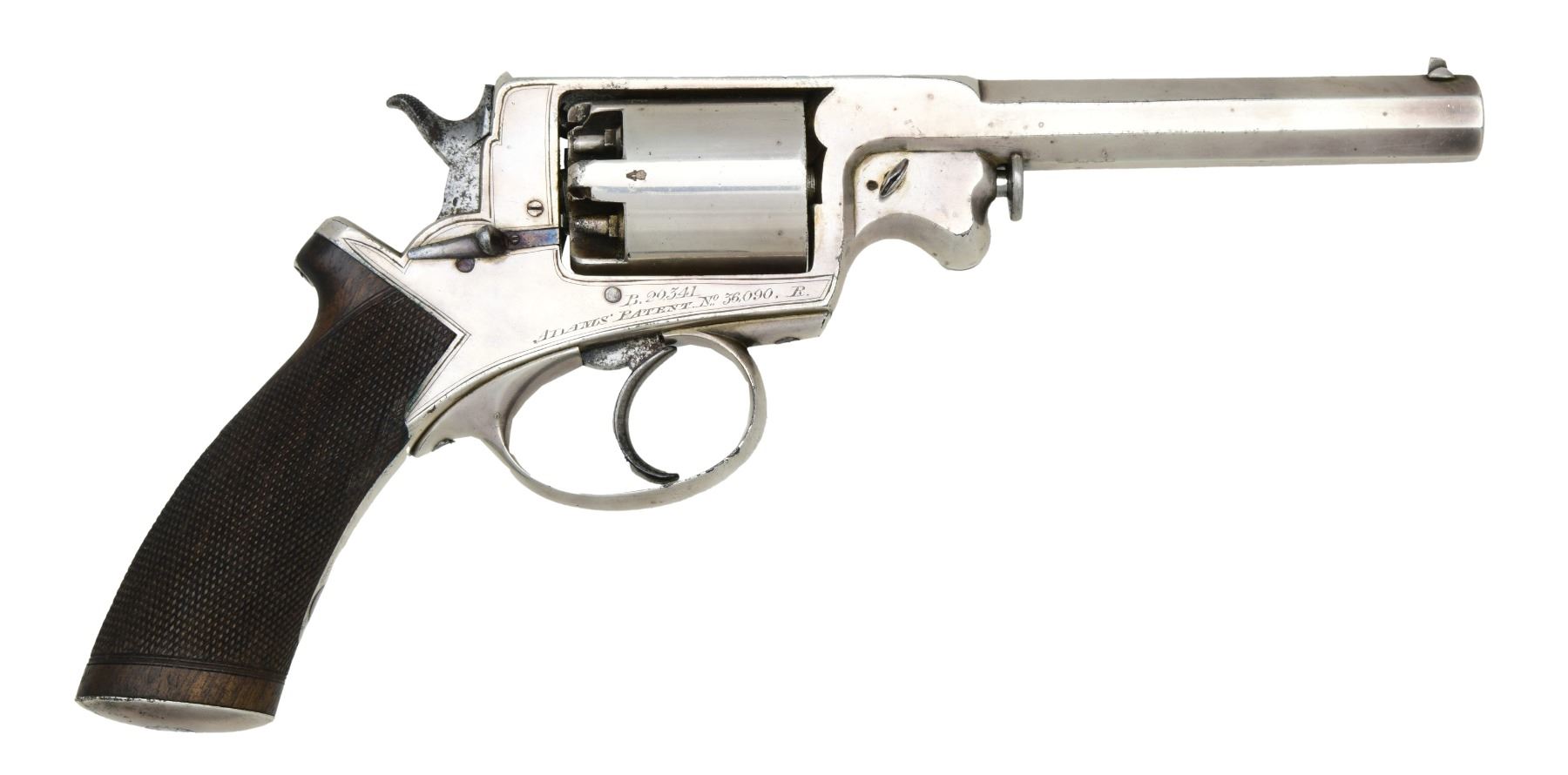 Cal. 44. S# B20341. Bbl. 5 2/4" octagon is integral w/ solid top strap frame. Top strap is marked "Robert Adams, 76 King William Street, London". Left bbl. flat is marked "L.A.C.". Left side of bbl. & frame is fitted w/ a Kerr patent rammer. Right side of frame is marked "Adams Patent No. 3690. R." below S#. Five shot round cyl. has matching S#. Cyl. & right side of bbl. have crown over V & crown proofs. Right side of frame is fitted w/ a bolt style safety. Silver finish. 1 piece checkered walnut grip w/ steel buttcap. The Beaumont Adams revolver was used by the British Army until 1880 & by both Confederate & Union forces during the American Civil War. UNATTACHED ACCESSORIES: English Trade casing w/ green felt fitted interior. Interior of lid has retailer label marked "B Coswell". Case contains powder flask, bullet mold, oil bottle, cleaning rod w/ accessories, bullet tin & round balls. Case has added finish over wear & handling marks. CONDITION: 80% silver finish acquiring a tarnish. Hammer shows pitting. Grips have moderate wear. Action cycles properly. Cyl. has substantial side play. Bore retains sound rifling showing spots of pitting. (01-25230/DS). ANTIQUE. $2,250-2,750.