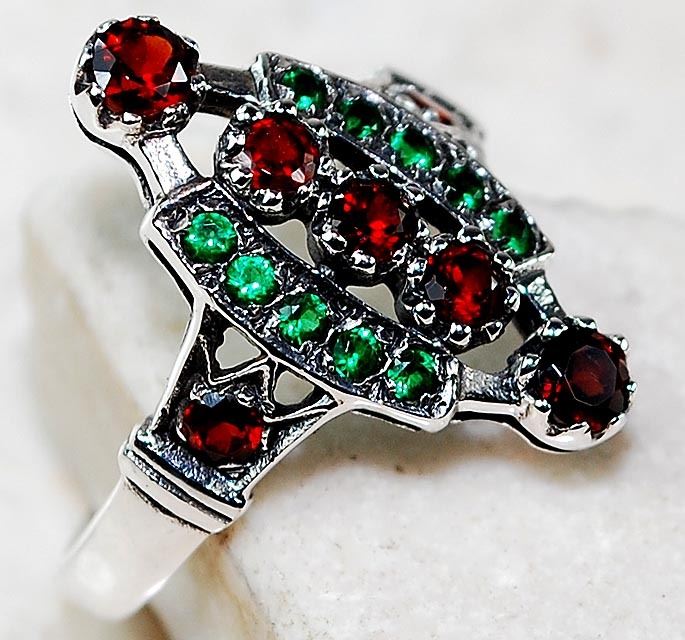 BEAUTIFUL NATURAL 1 CTTW TSAVORITE GARNET AND RHODOLITE RED GARNET RING. MOUNTED IN ELABORATELY DESIGNED SOLID .925 STERLING SILVER SIZE 6. 12.5 CTTW OR TOTAL GRAM WT IS 2.6 GRAMS. VERY PRETTY RING.BRILLIANT CLARITY AND SPARKLE