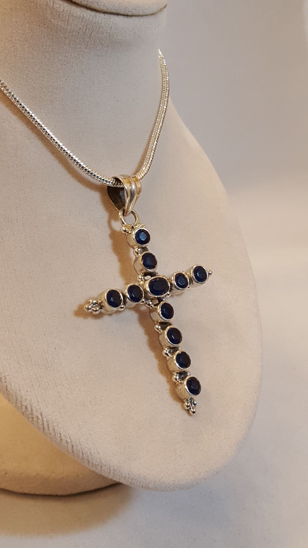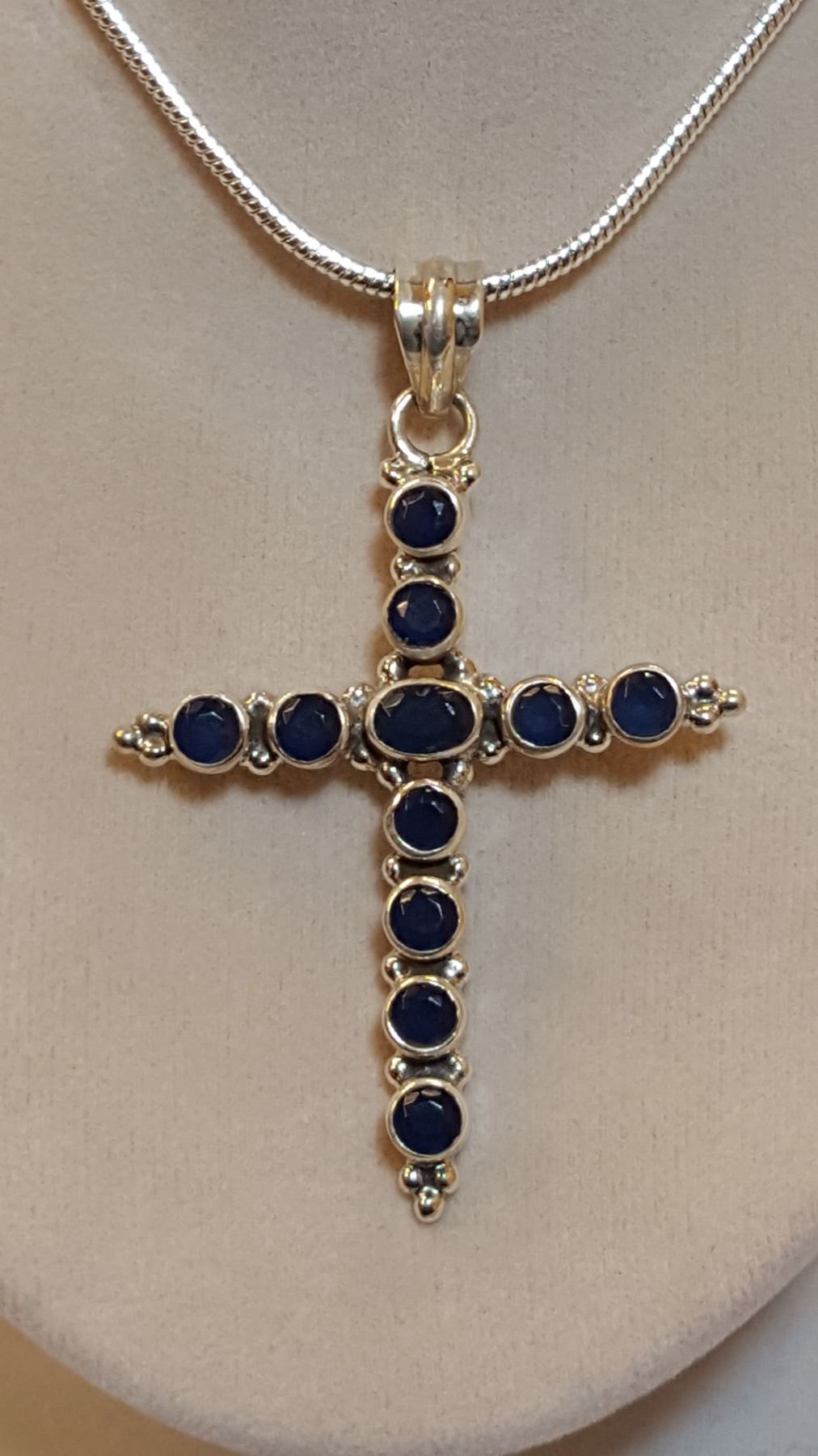 BEAUTIFUL 10.75 CT GEM WT NATURAL BLUE SAPPHIRE CROSS PENDANT. MOUNTED IN SOLID .925 STERLING SILVER. IN CLUDES 20 " 2 mm. CHAIN. 15 TOTAL GRAM WT.
