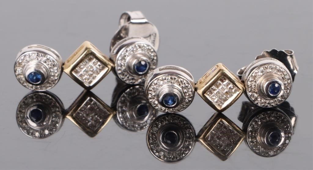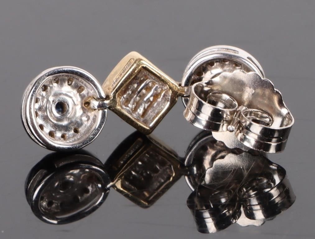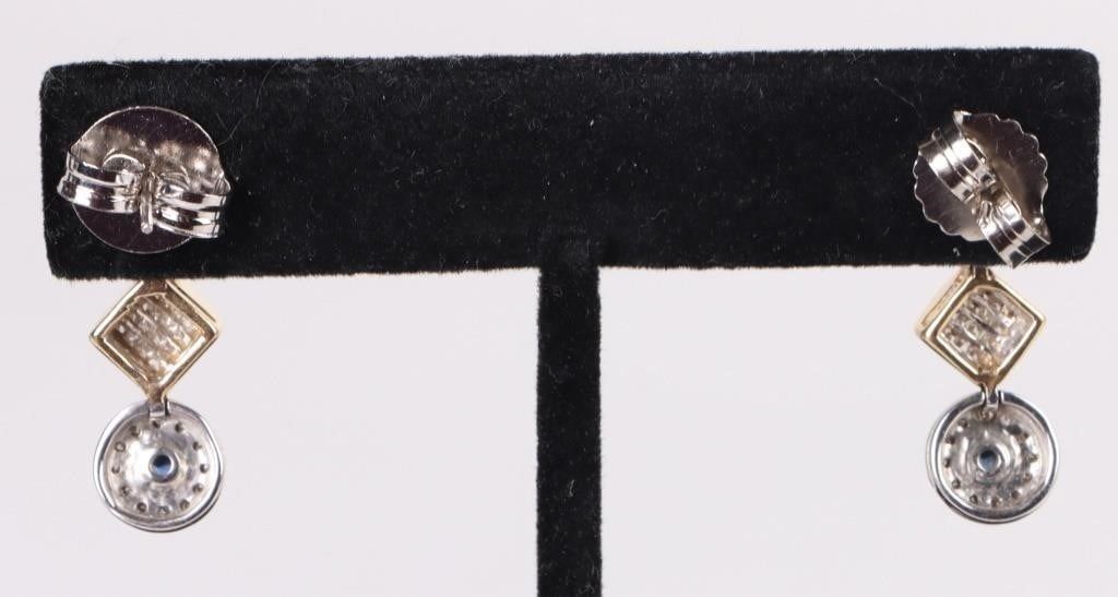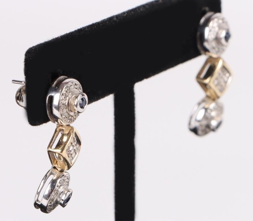 Beautiful 14K yellow & white gold diamond & sapphire halo drop earrings.
