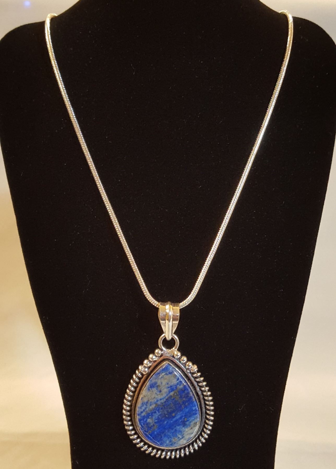 BEAUTIFUL 15 CT NATURAL SODALITE PENDANT.MOUNTED IN ELABORATLY DESIGNED .925 SOLID STERLING SILVER.106 CTTW INCLUDING THE 20 " 2 mm. CHAIN. ABSOLUTLY STUNNING. Sodalite stimulates the mind and consciousness to create enhanced intuition, creativity, and powers of analysis and observation.