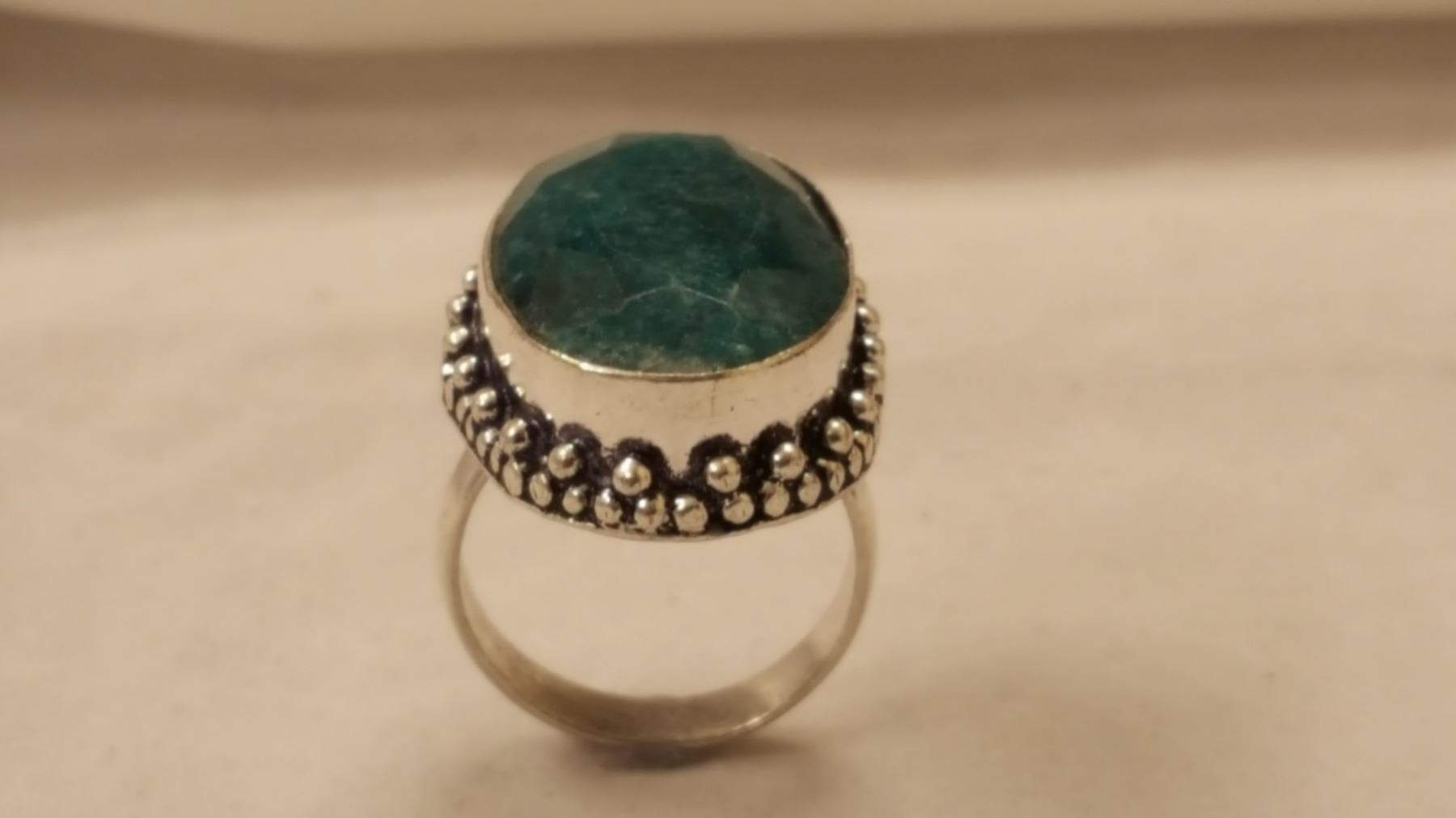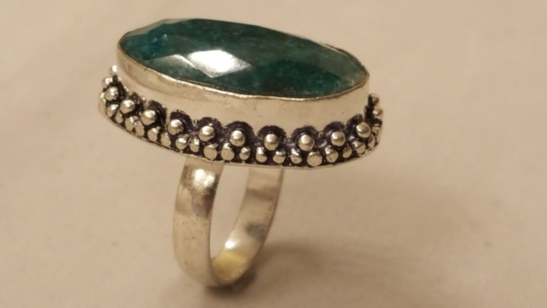 BEAUTIFUL 17 CT EMEARLD GREEN COLOR QUARTZ RING . MOUNTED IN ELABORITE DESIGNED SOLID .925 STERLING SILVER , SIZE 8 1/2 11.4 TOTAL GRAM WT