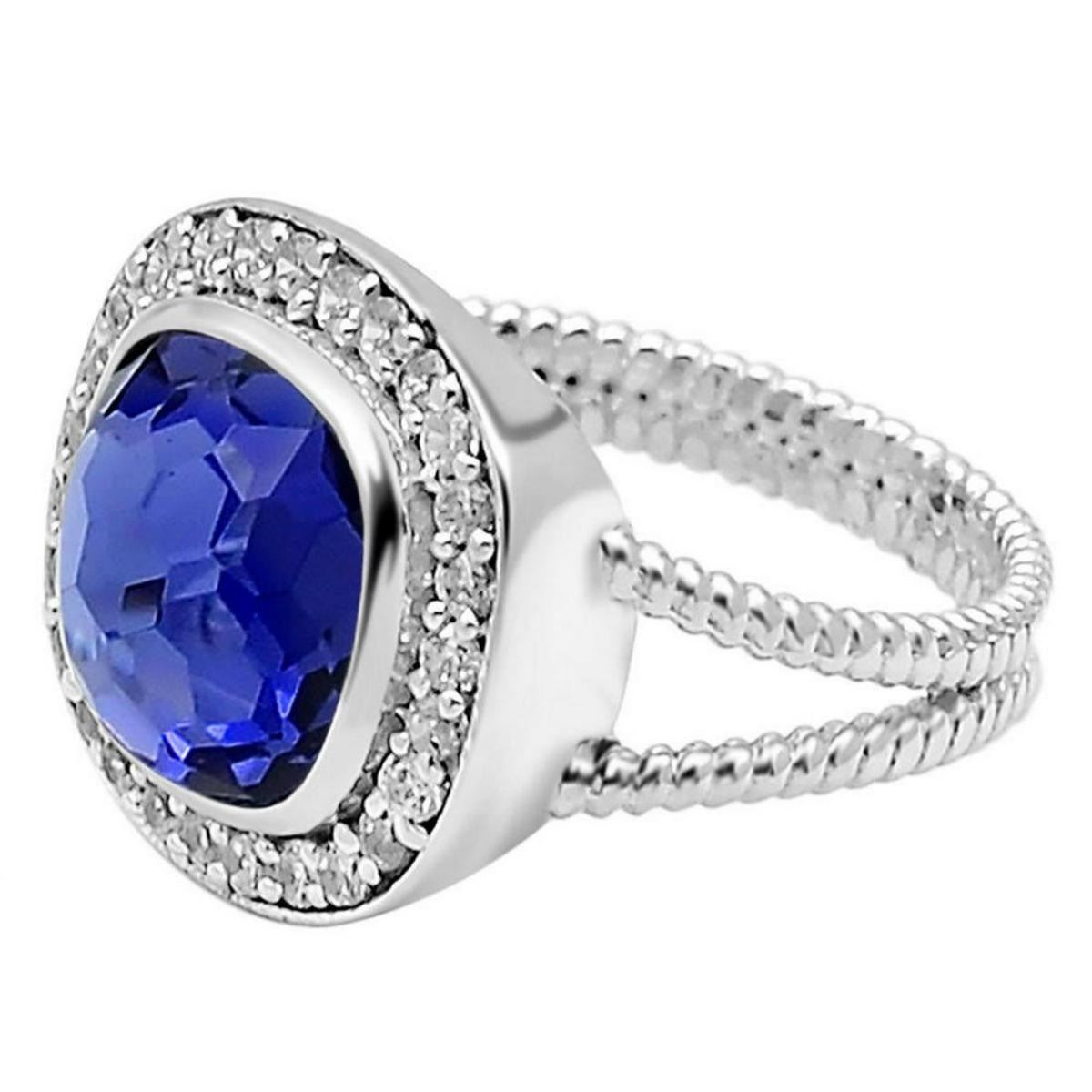 BEAUTIFUL 4.7 CT VIOLET BLUE TANZANITE RING. THIS LAB CREATED TANZANITE IS EYE CLEAN MOUNTED IN SOLID .925 STERLING SILVER. CUSHION CUT. SIZE 7 1/2 . GRAM TOTAL WT IS 5.2 TOTAL GRAMS