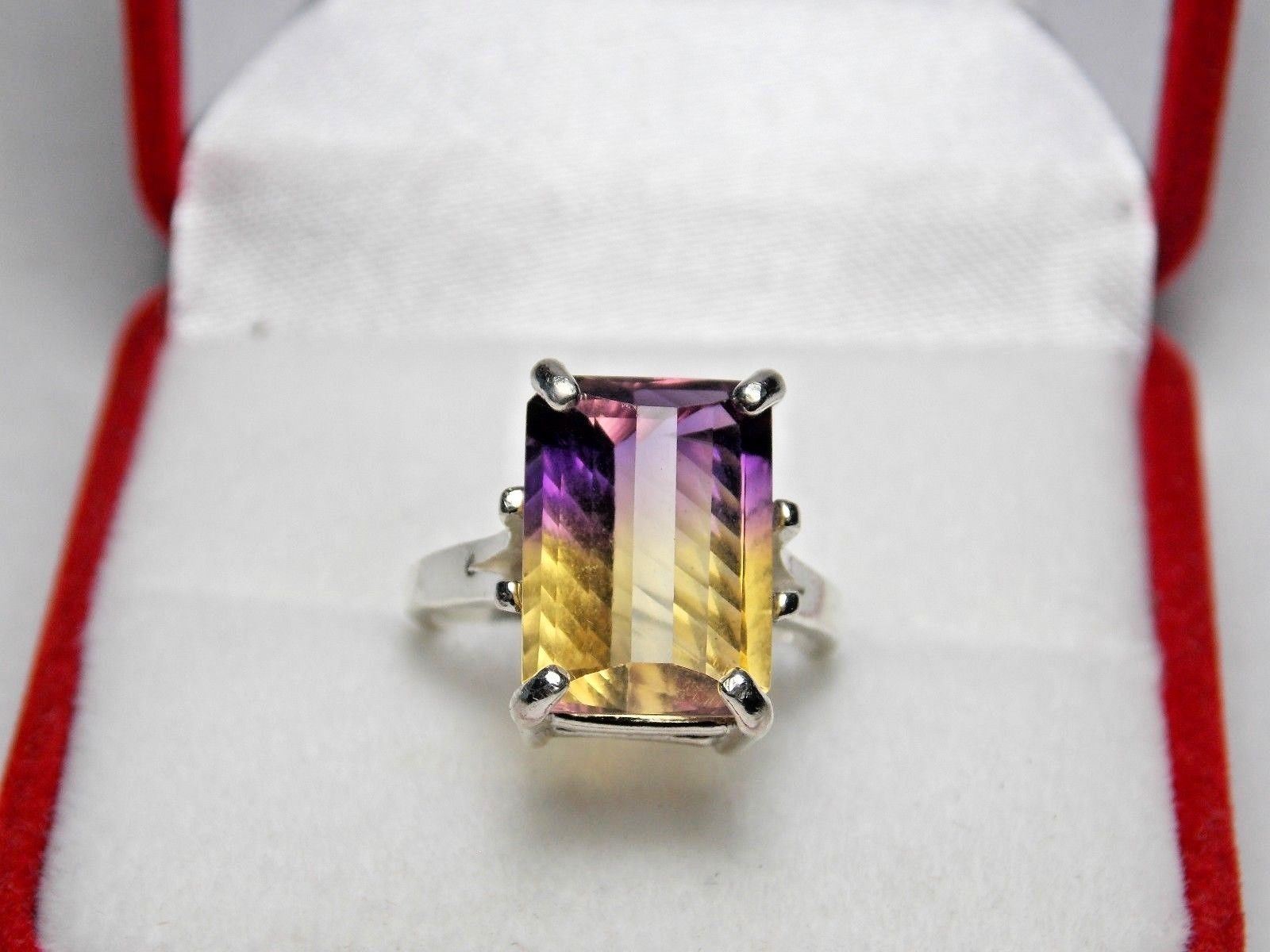 BEAUTIFUL 7.23 CT 100 % NATURAL AMETRINE RING .THIS INVESTMENT QUALITY RING IS EYE CLEAN. A BEAUTIFUL FANCY EMERALD CUT MOUNTED IN ELABORATELY DESIGNED SOLID .925 STERLING SILVER SIZE 8 TOTAL GRAM WT.IS 3.9 GRAMS. HEATED ONLY.DON'T MISS THIS NATURAL BEAUTY.