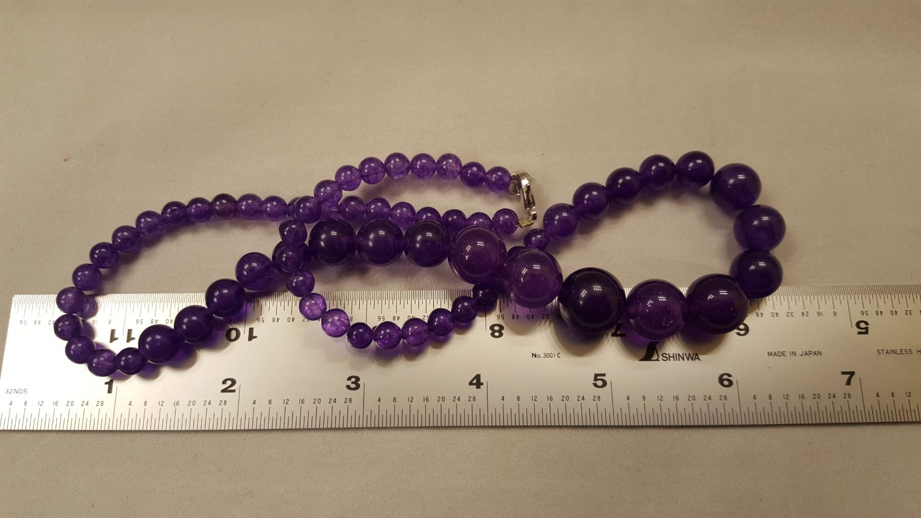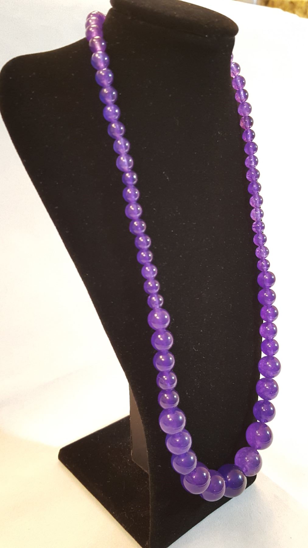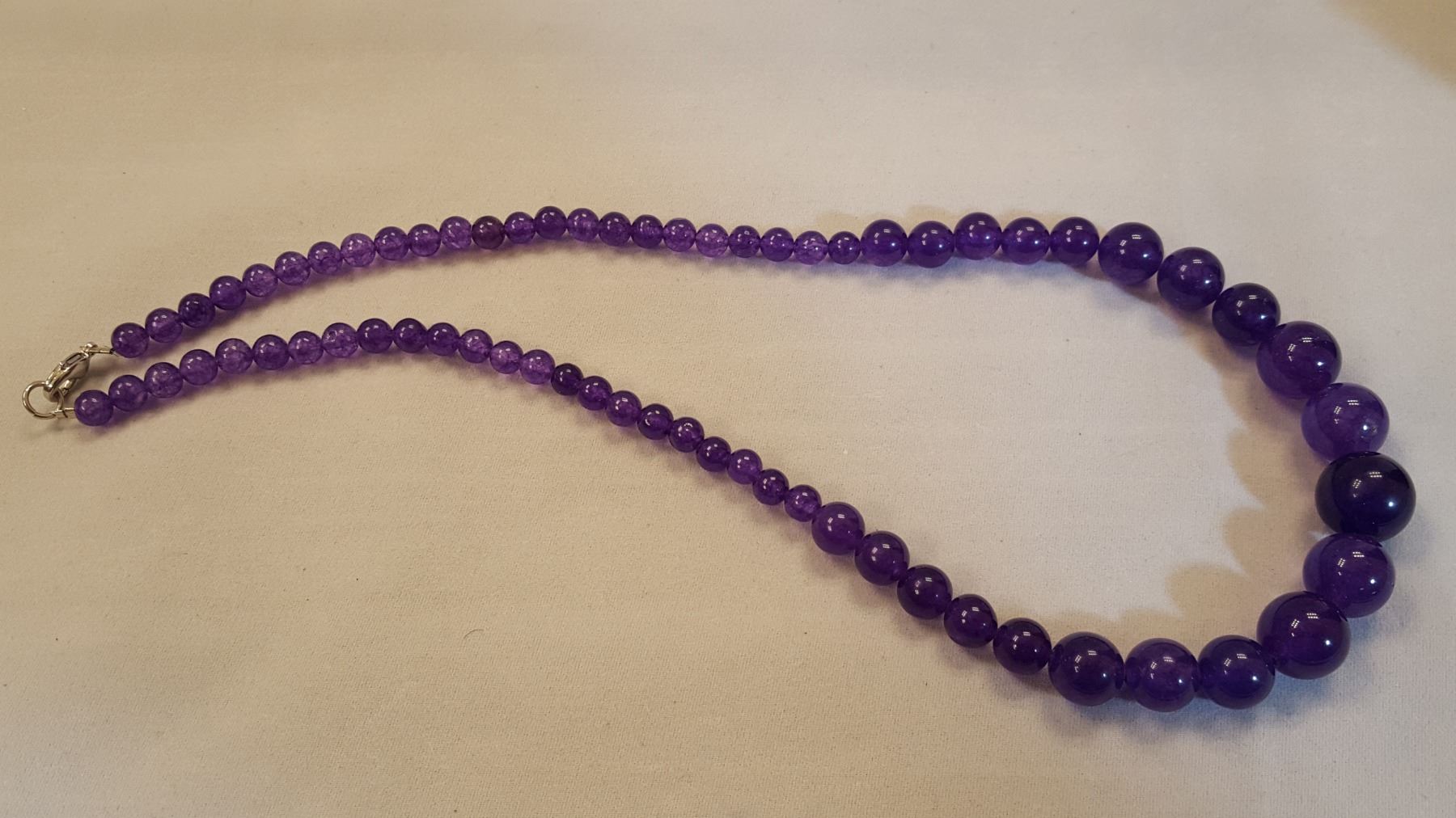 BEAUTIFUL AMETHYST NECKLACE 209 CTTW 18 " LONG. GRADUATING BEADS FROM 4 mm to 14 mm. BEADS . STRONG COLOR DISPLAYING A VIVID LUSTER AND POLISH AND A FINE EVEN HUE