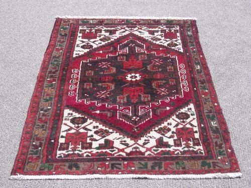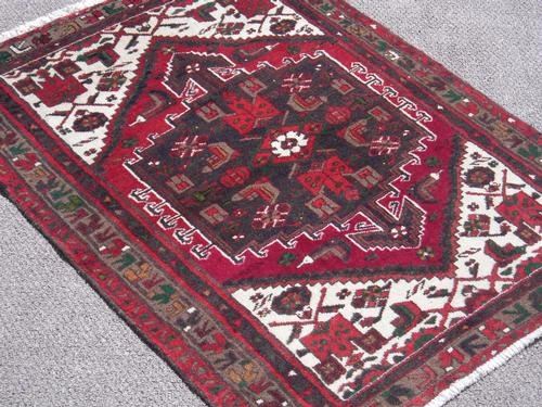 BEAUTIFUL AND CHARMING HIGH QUALITY PERSIAN HAMADAN. SIZE 4.11 X 3.4 FEET, MADE OF FINE QUALITY BABY LAMB'S WOOL PILE ON COTTON FOUNDATION, ALL NATURAL VEGETABLE DYE. HAND WOVEN IN HAMADAN, Iran. THIS RUG HAS A CLASSIC GEOMETRIC DESIGN ONE A DARKER THEME, EARTHY TONS ON THE BORDERS, ON A RICH RED IN THE BACKGROUND. THE CONSTRAST BETWEEN THE LIGHT COLORS AND THE DARK COLORS MAKE THIS PEACE STANDOUT AMONG MANY OTHER ONES.