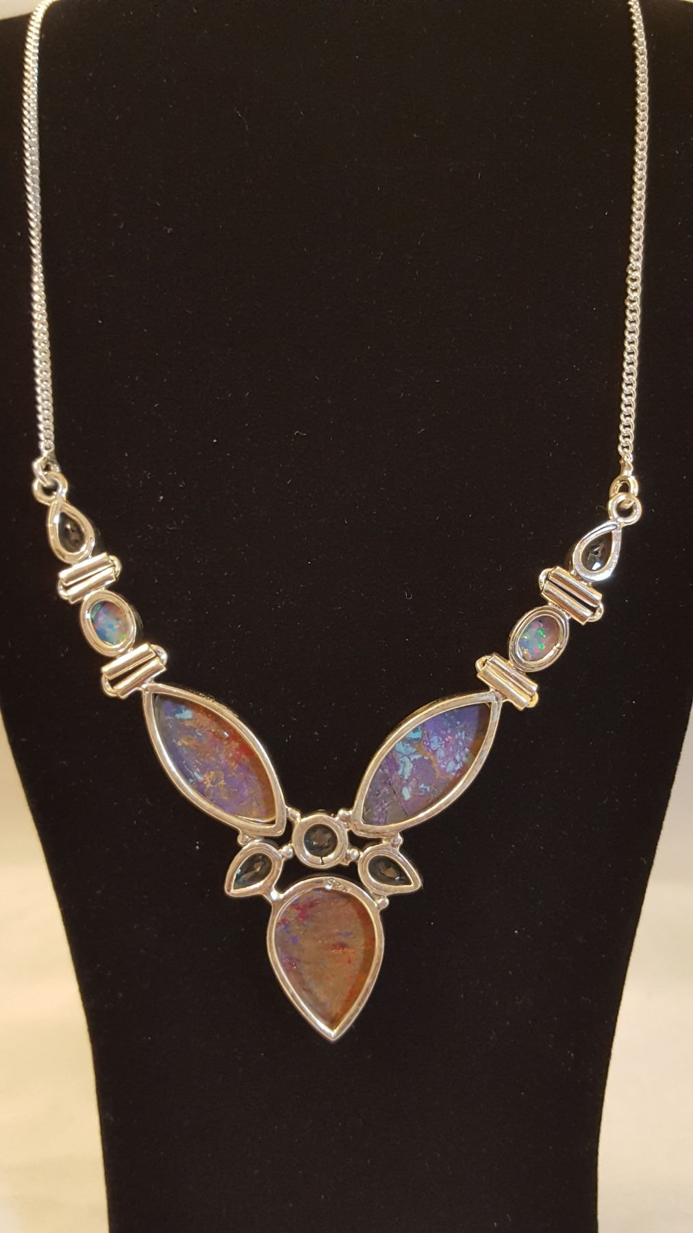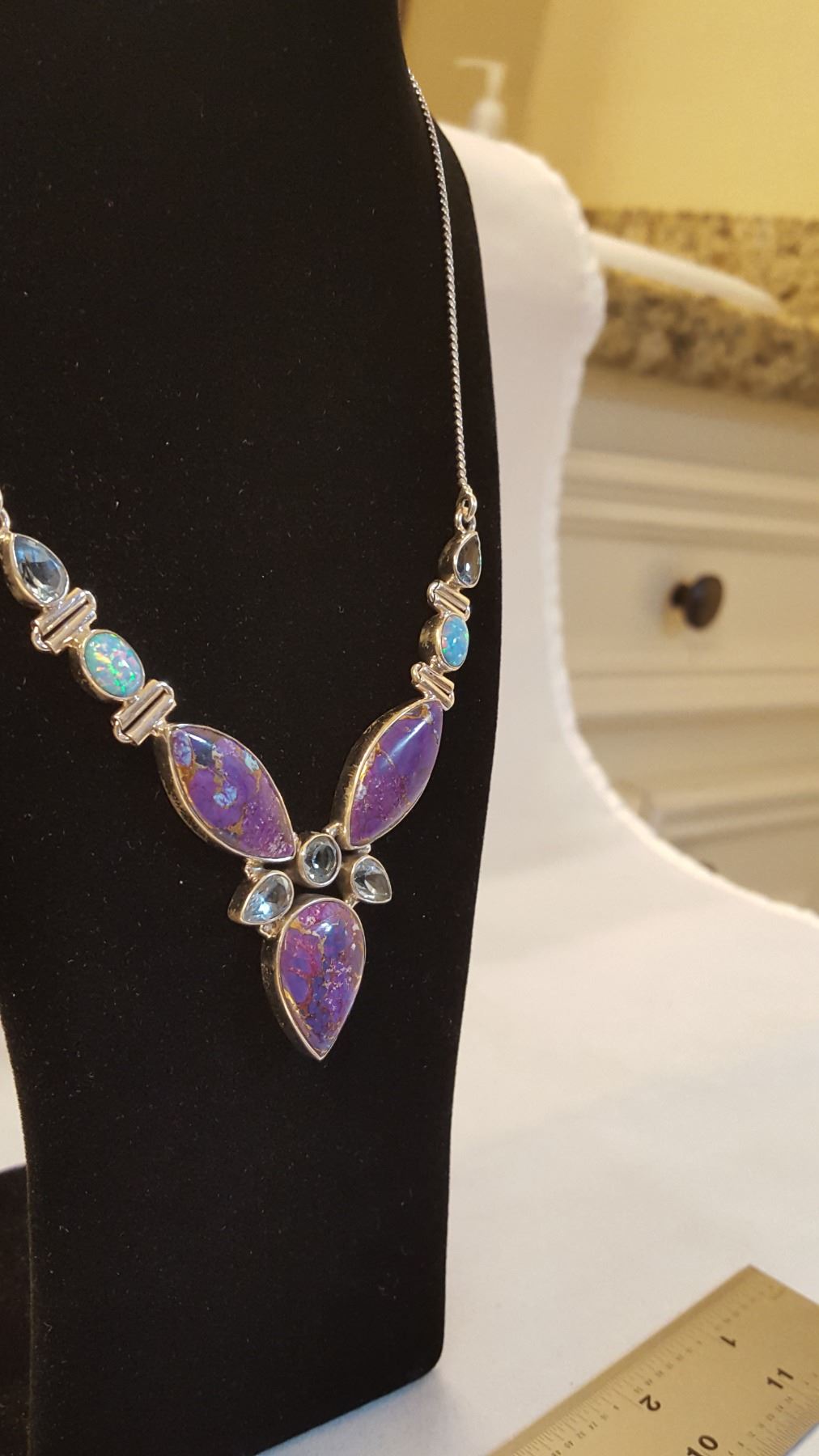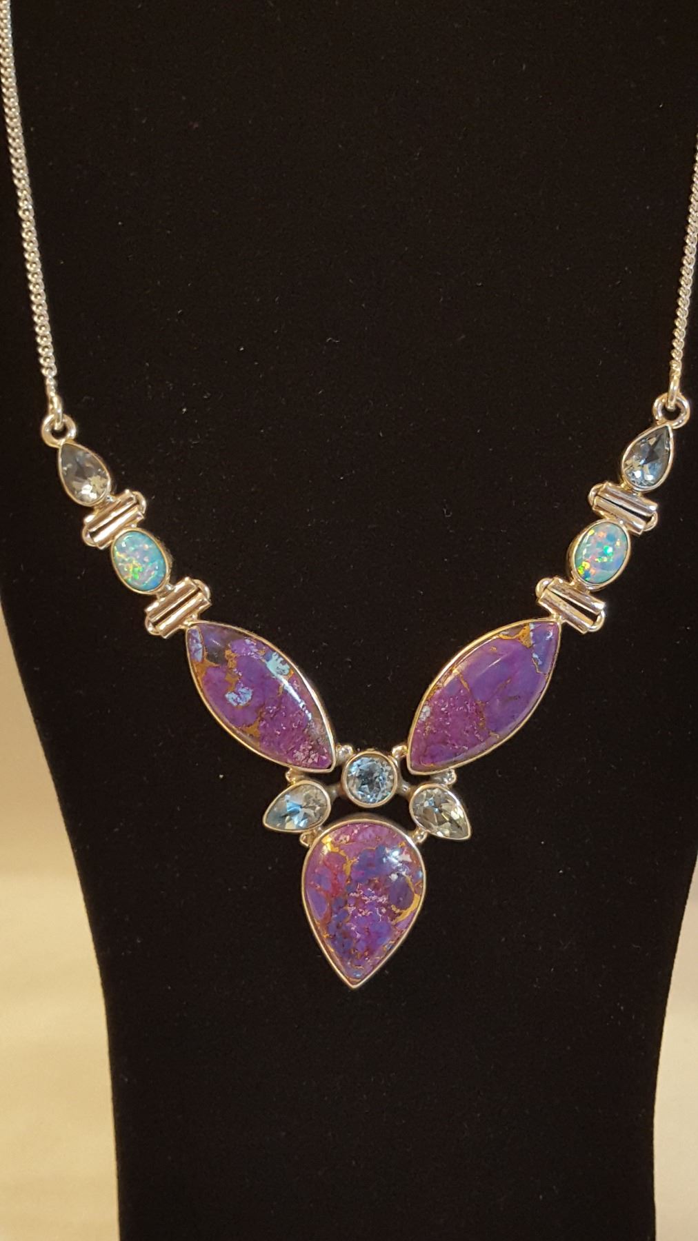 BEAUTIFUL NATURAL ARIZONA LAVENDER TURQUOISE COPPER ACCENTS NECKLACE. INCLUDES 5 SKY BLUE TOPAZ HIGHLIGHT STONES. MOUNTED IN SOLID .925 STERLING SILVER. 19 " STERLING SILVER CHAIN. 22 GRAM TOTAL WEIGHT. TURN SOME HEADS WITH THIS NECKLACE LADIES.