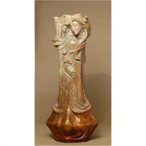 Wonderful lovely vase by French artist Loran is a stunning example of Art Nouveau style, with its design of flowering vines out of which bloom two lovely ladies' faces on each side. This is a top quality vase that is sure to be treasured for and by generations to come. The vase stands 17.5 high, and is signed with the title in the bronze.