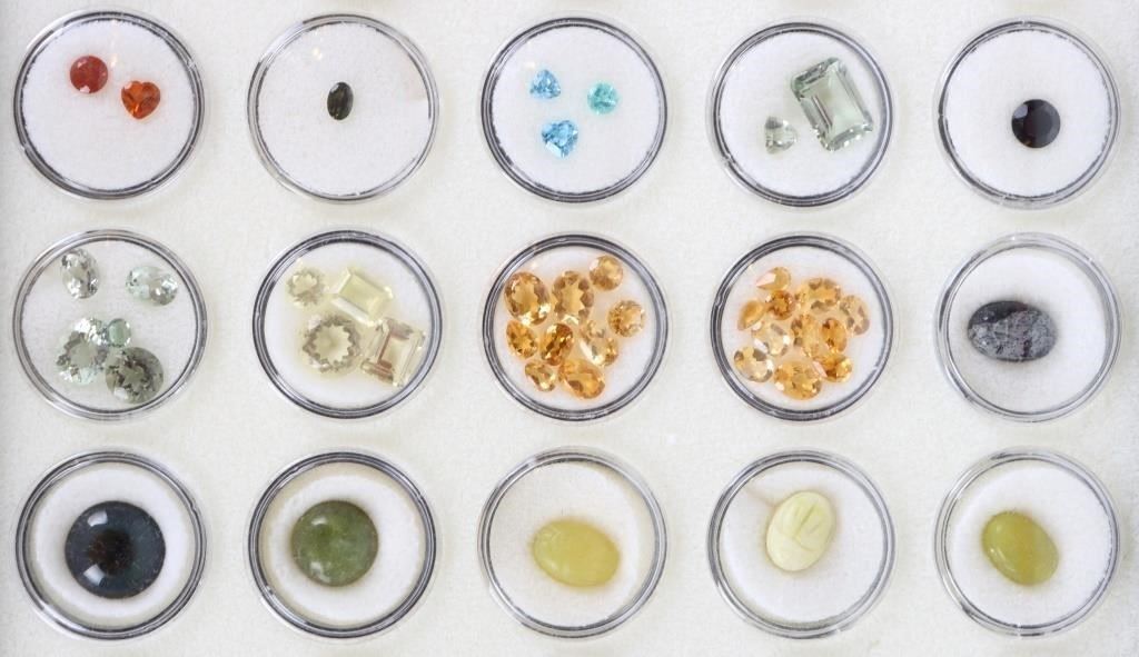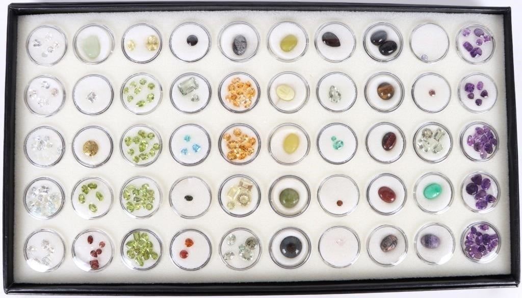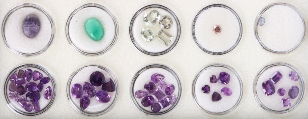 Beautiful assorted gemstones w/ tray to include jade, amethyst, topaz and more. Gemstone cuts to include round, pear, cushion and more.